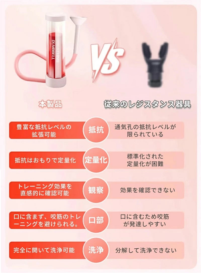 → 当社の製品は、ウェイトスタックで負荷を数値化(20g〜100g)、1分で肺活量の変化を実感、3週間で持久力最大40%UP※
