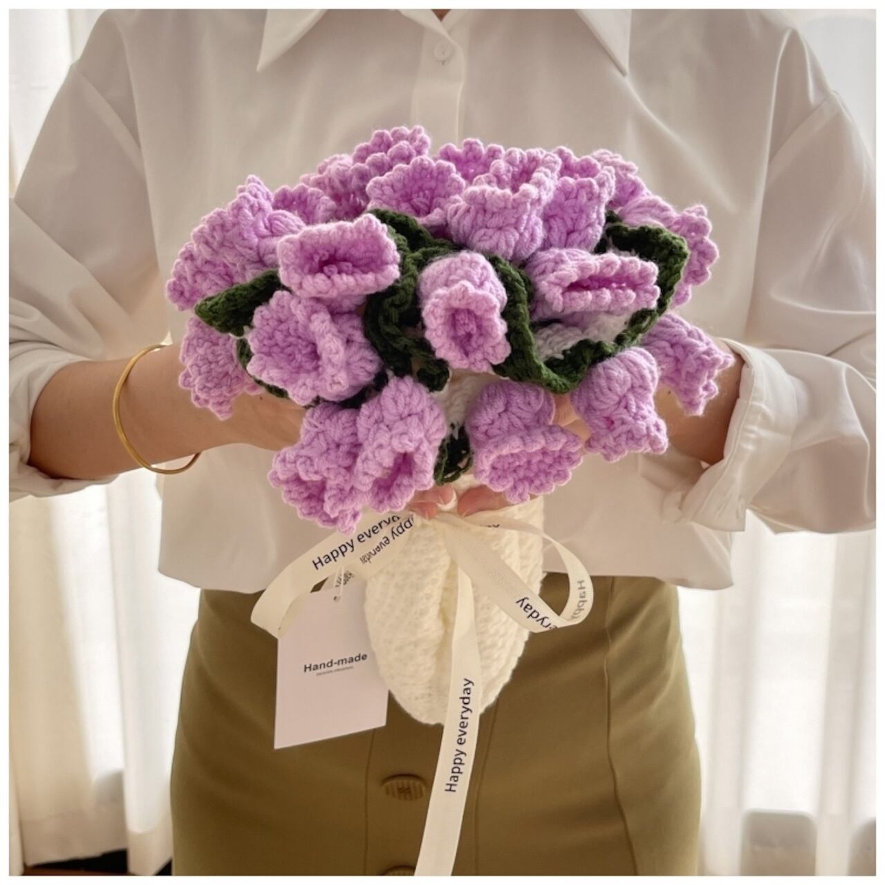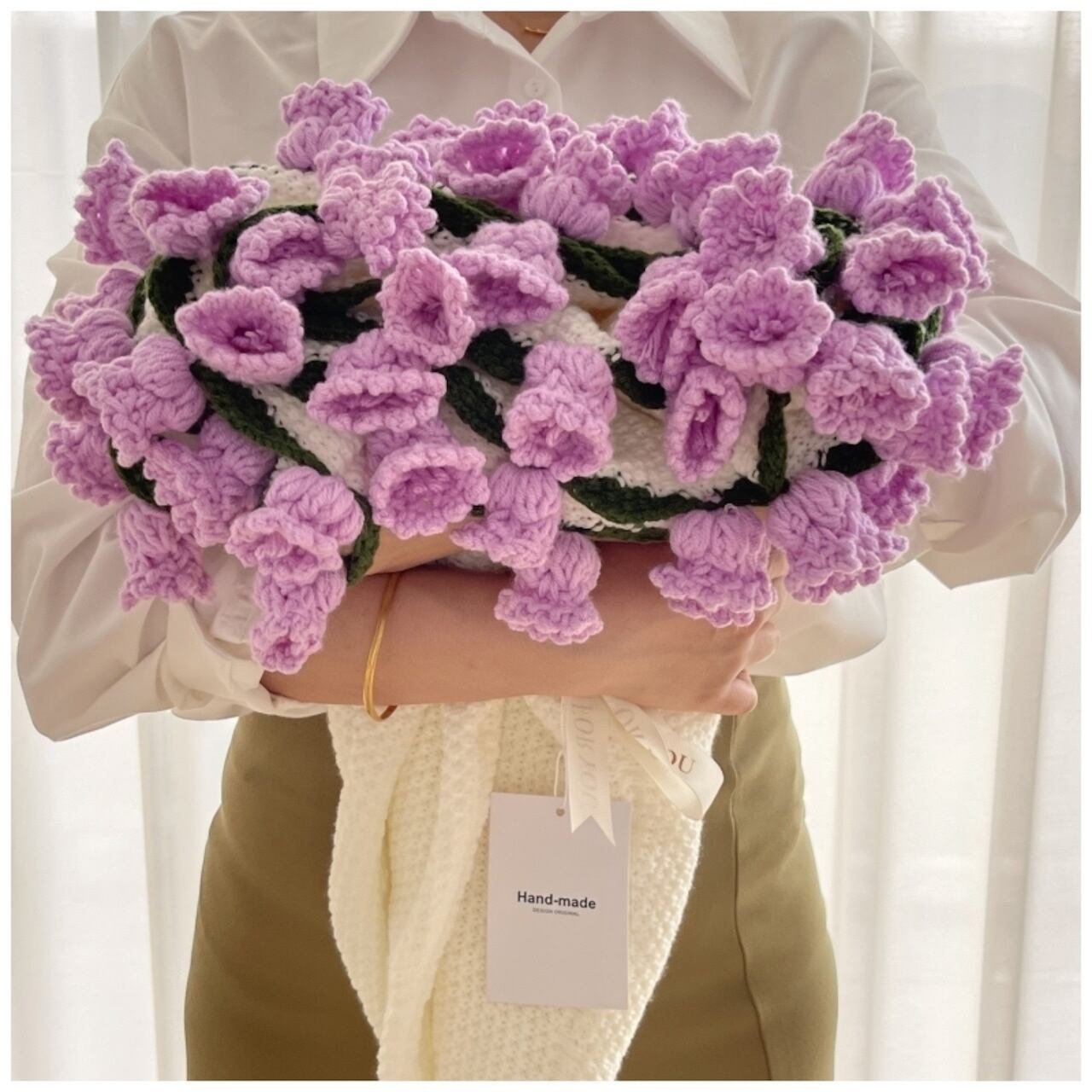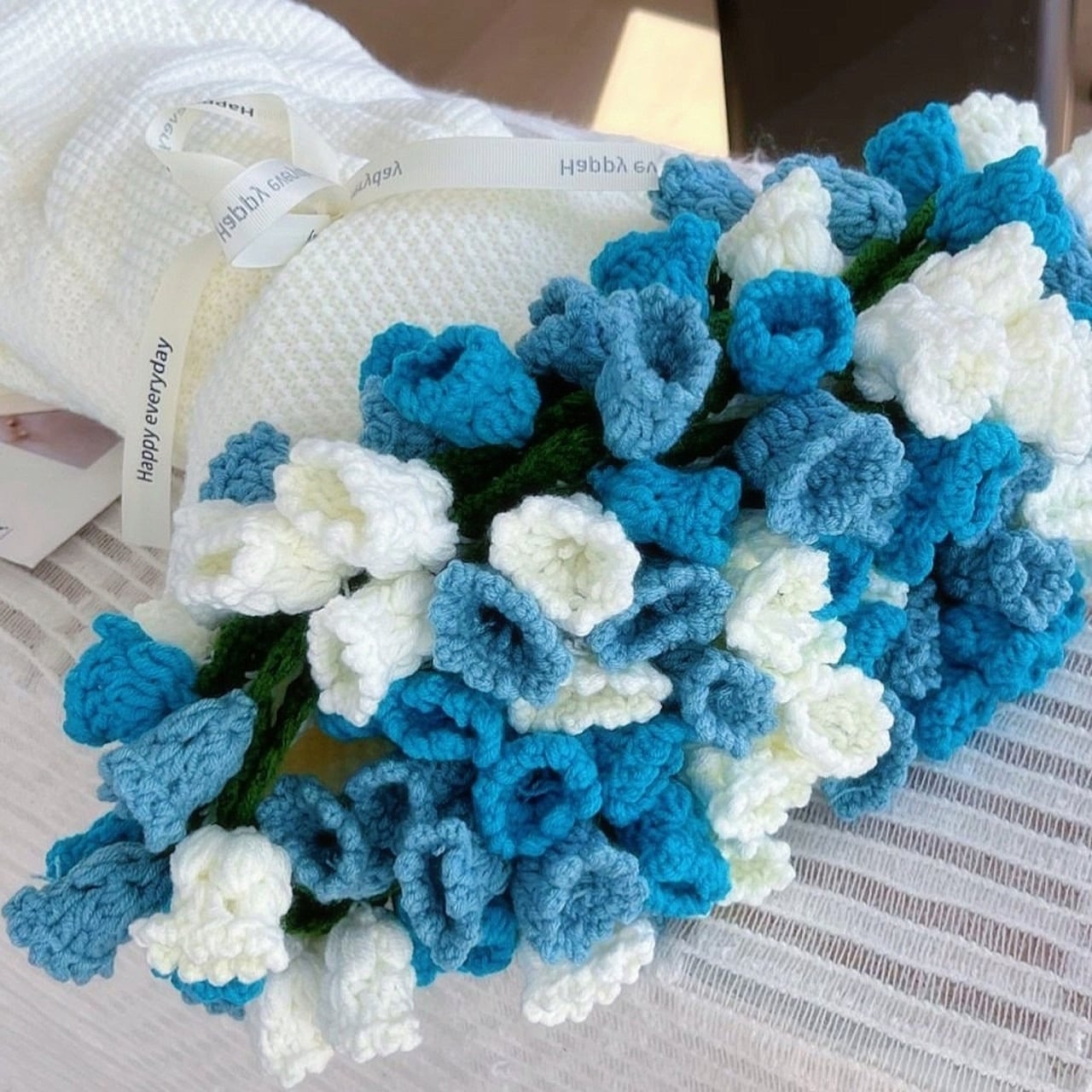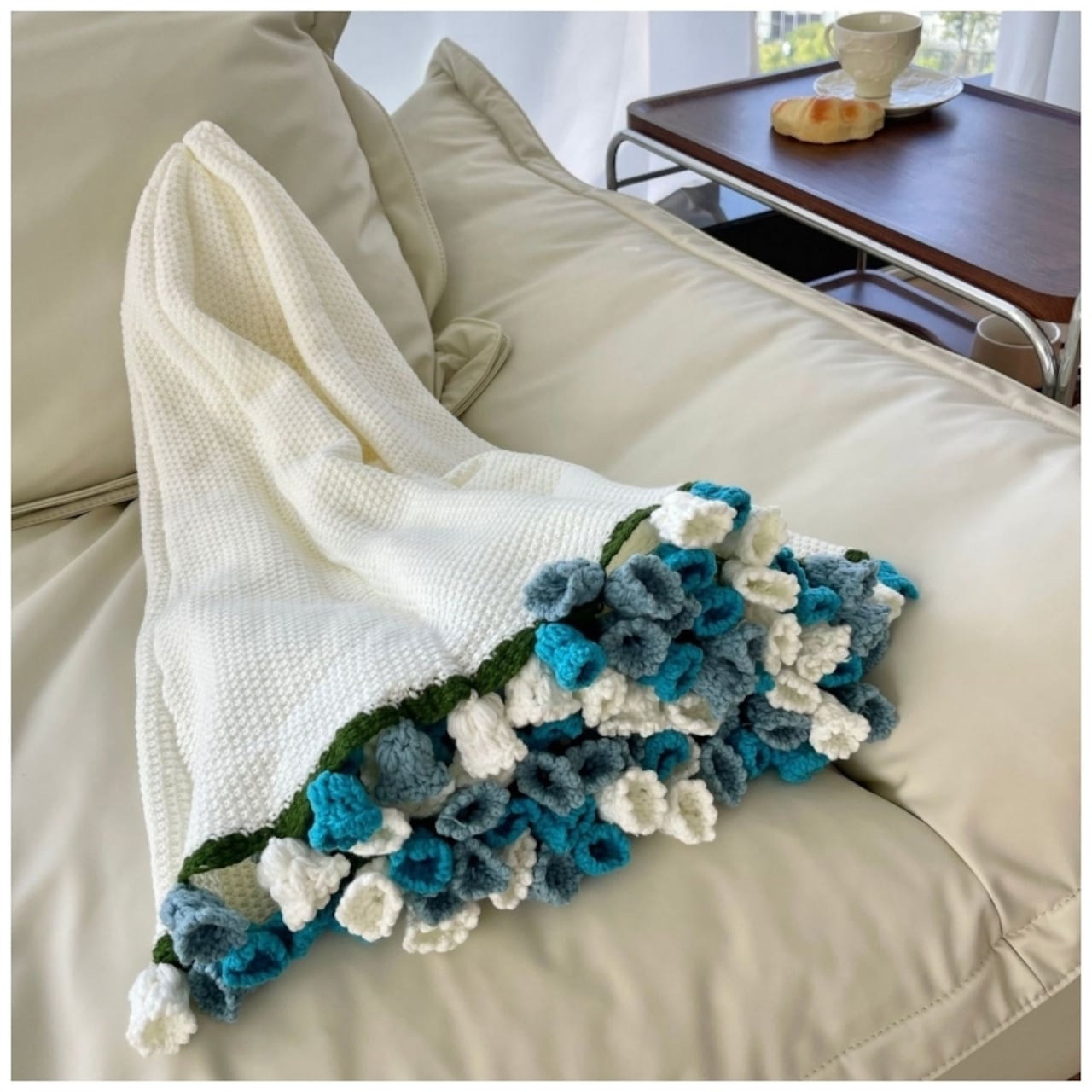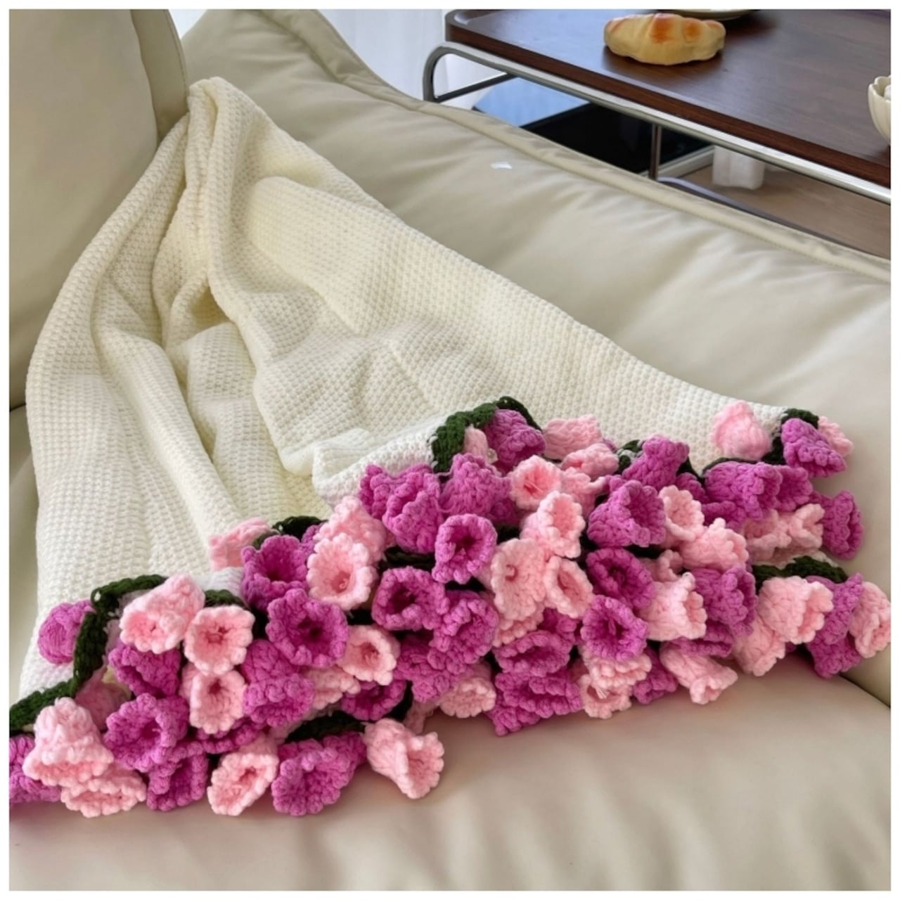 本品は、機械では表現できない温かみを持つ全手作業のかぎ針編みブランケットです。中央に見事に編み上げられた鈴蘭の花は、一切の枯れる心配がなく、お部屋に永続的な春の息吹をもたらします。お客様にお届けするのは、職人の手によって完成されたそのままの状態の製品ですので、届いたその日からお楽しみいただけます。
