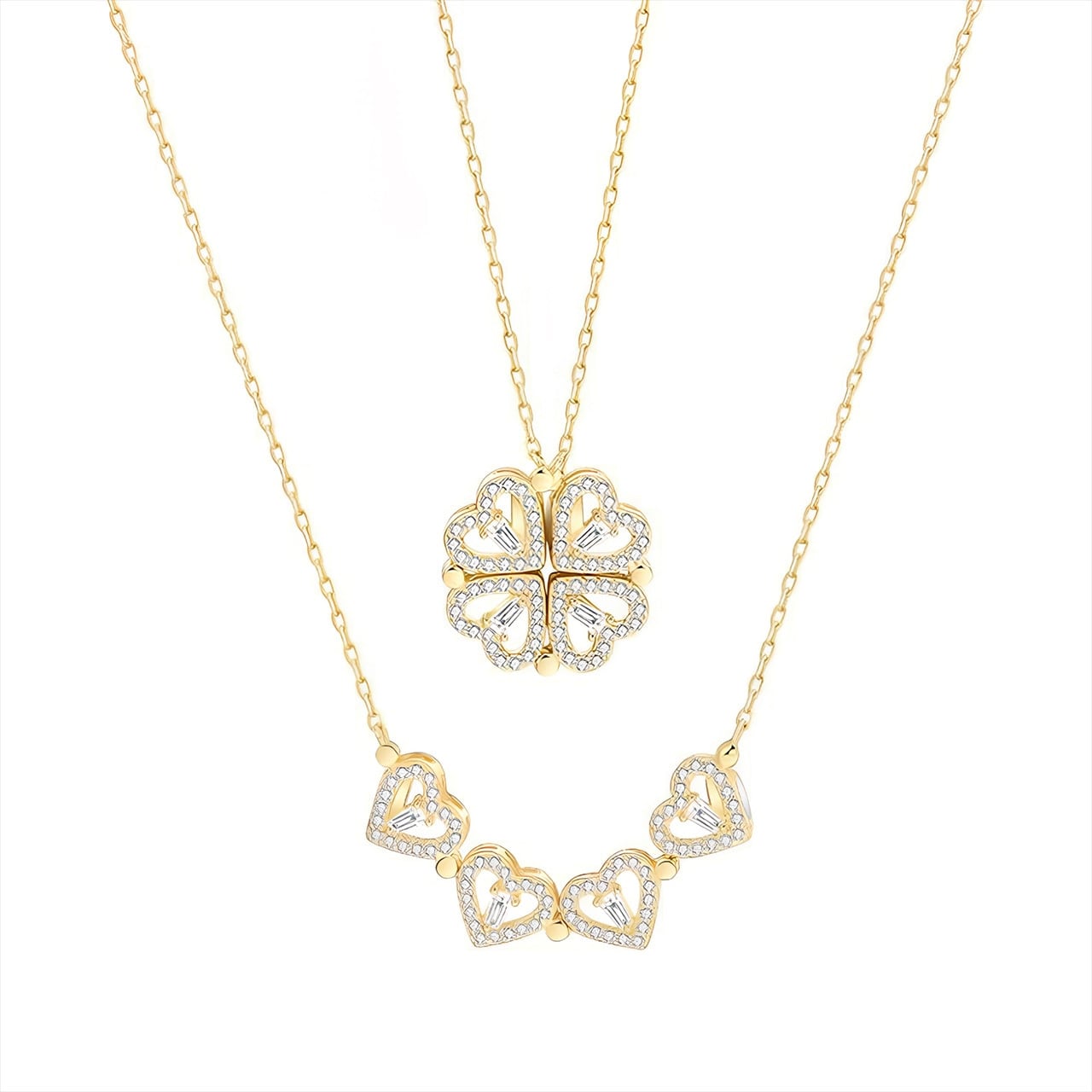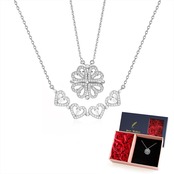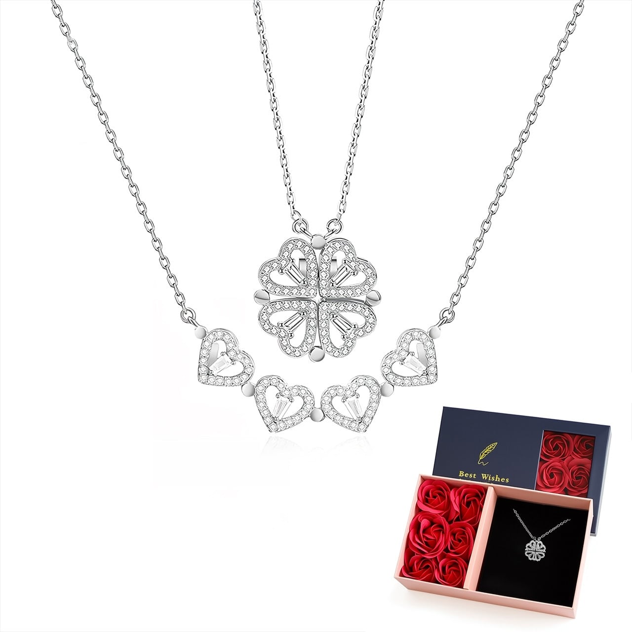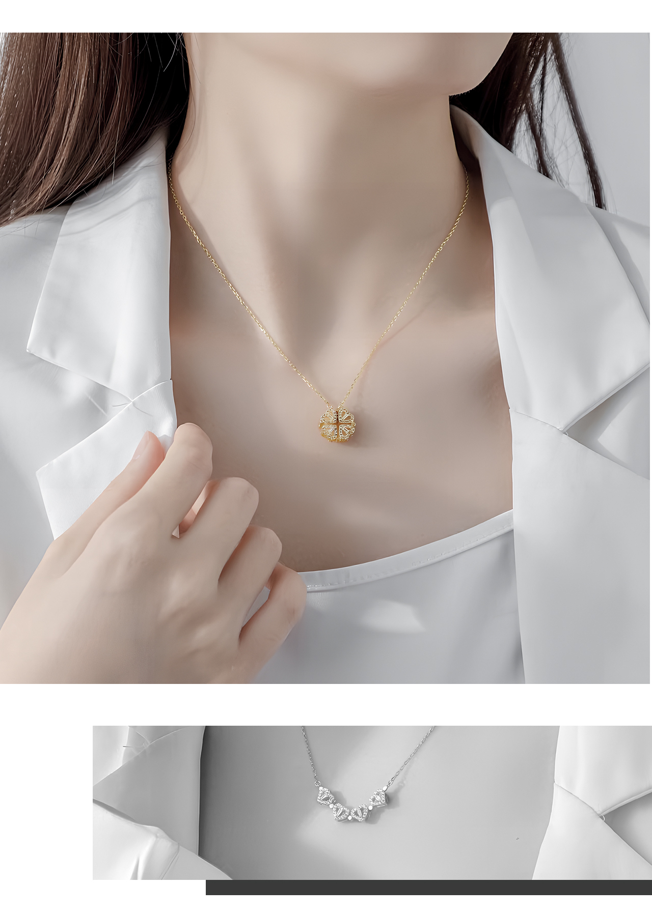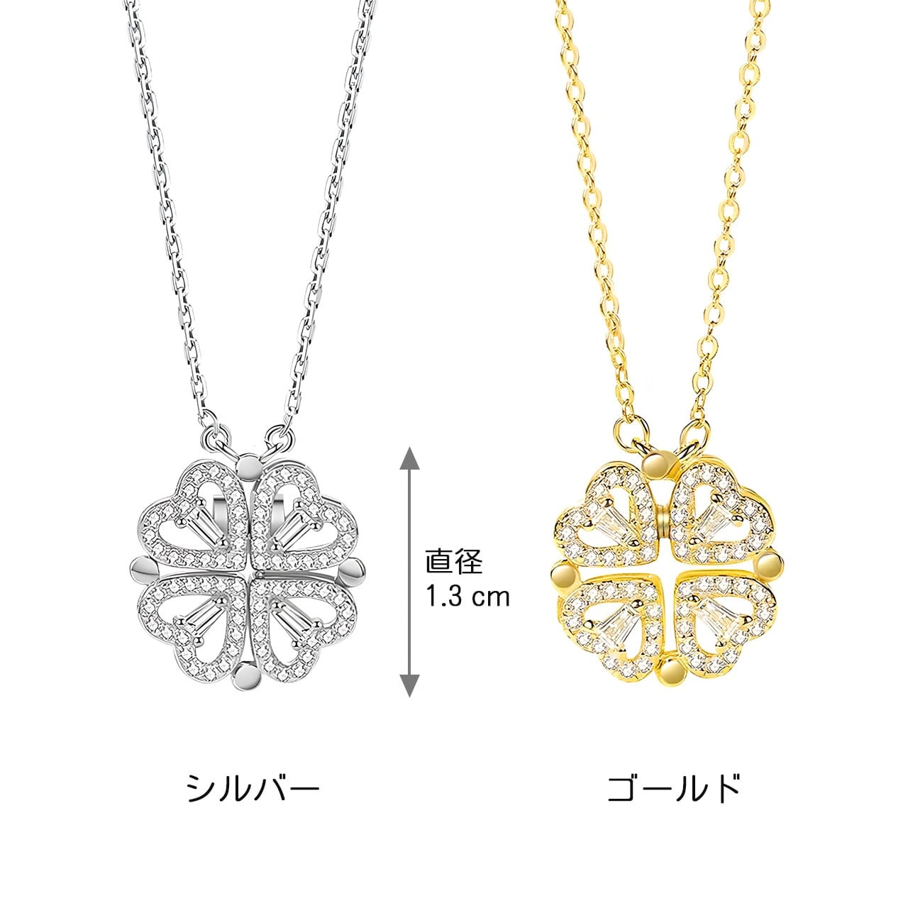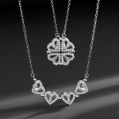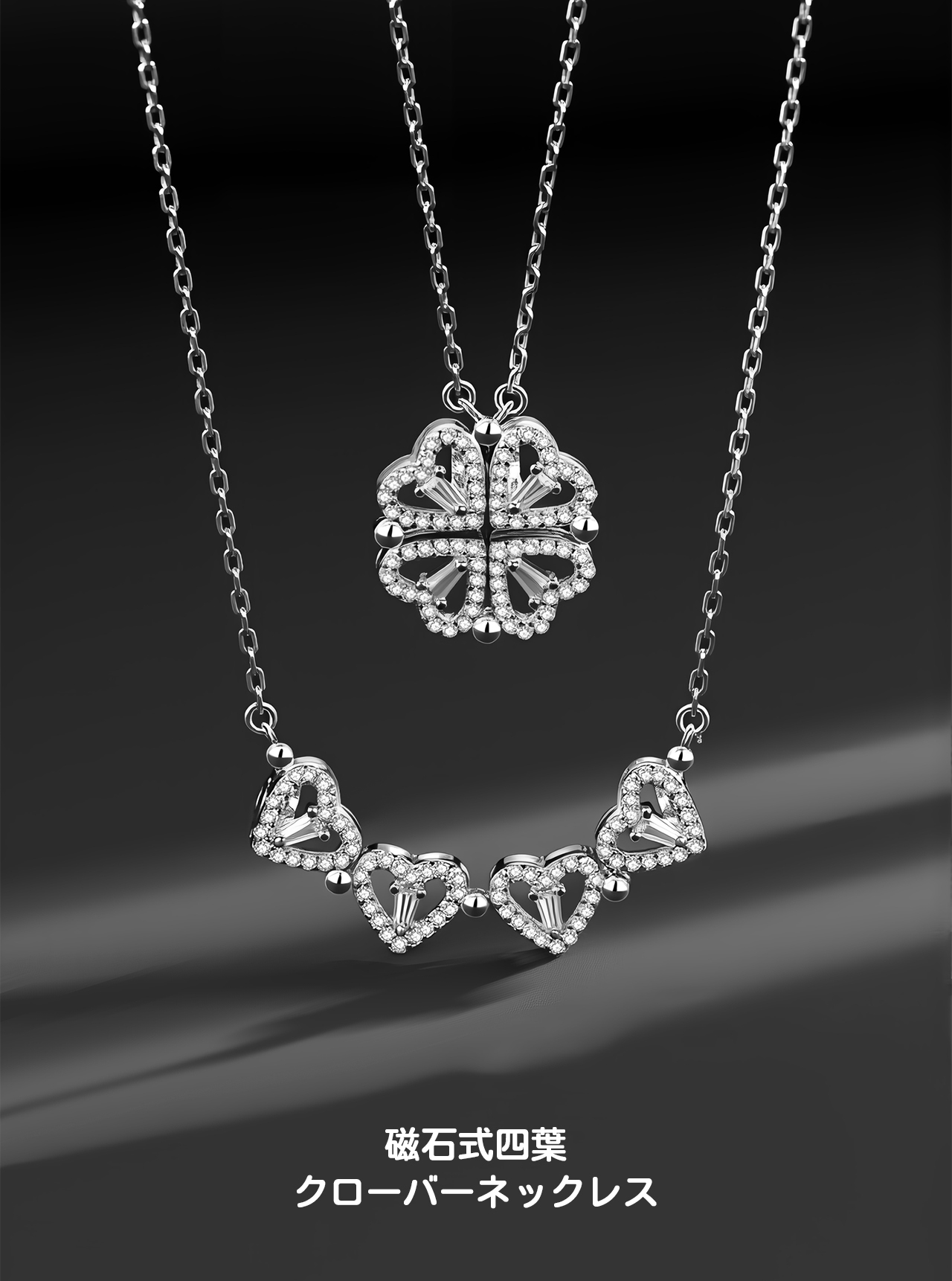 B79 .マグネット式2WAY着用 ハート型 四つ葉クローバーネックレス ▼ S925銀製 人工ジルコニウム装飾