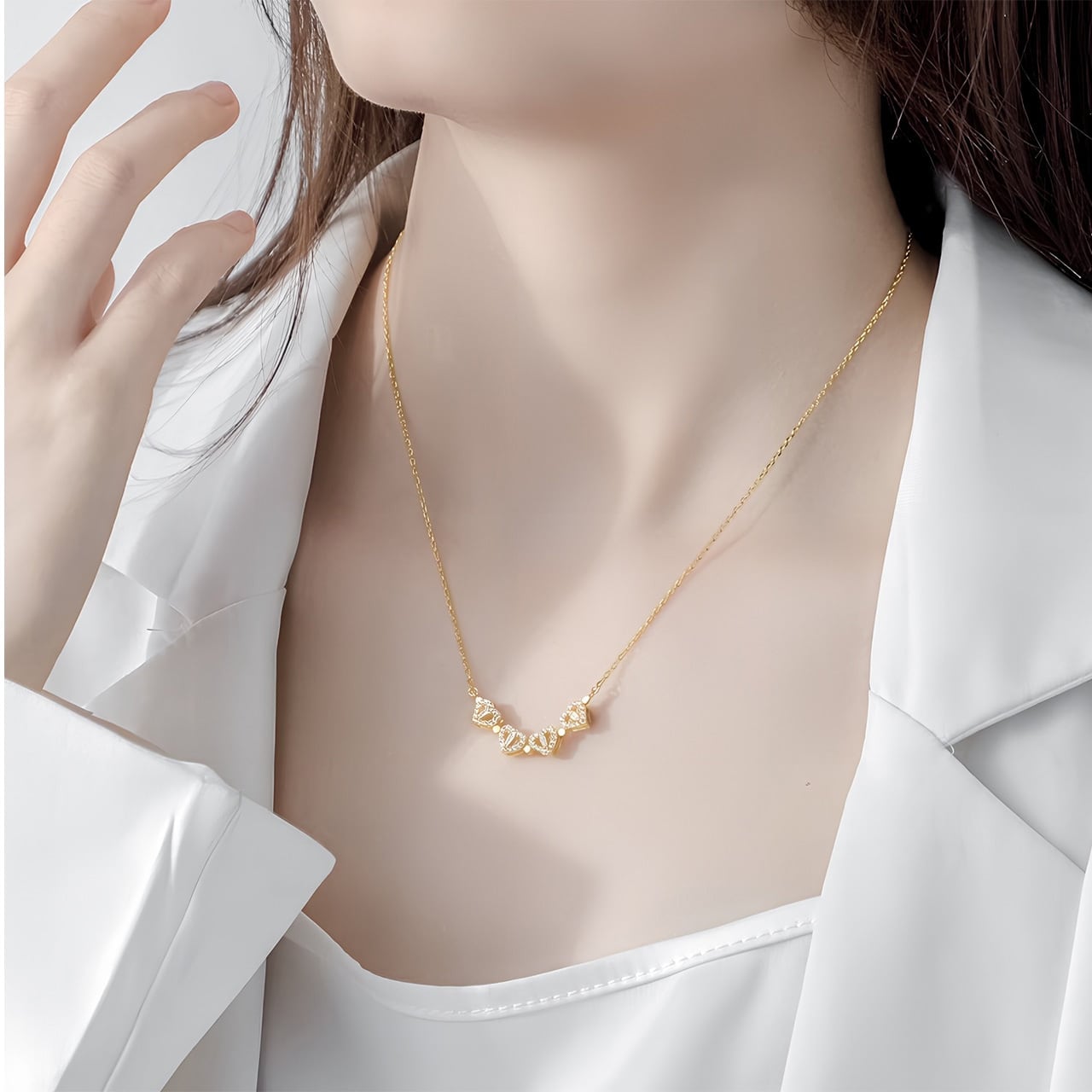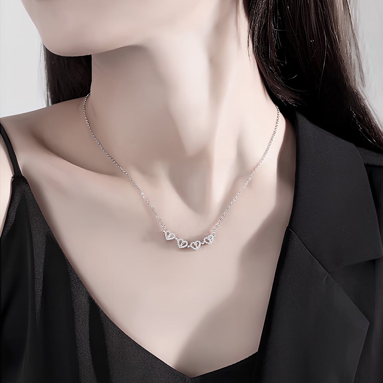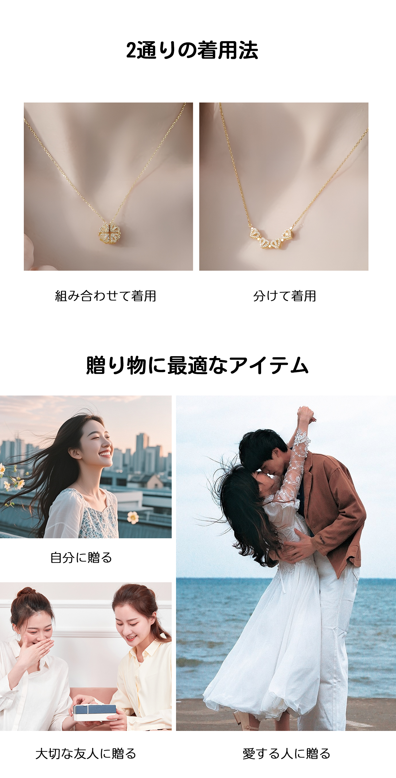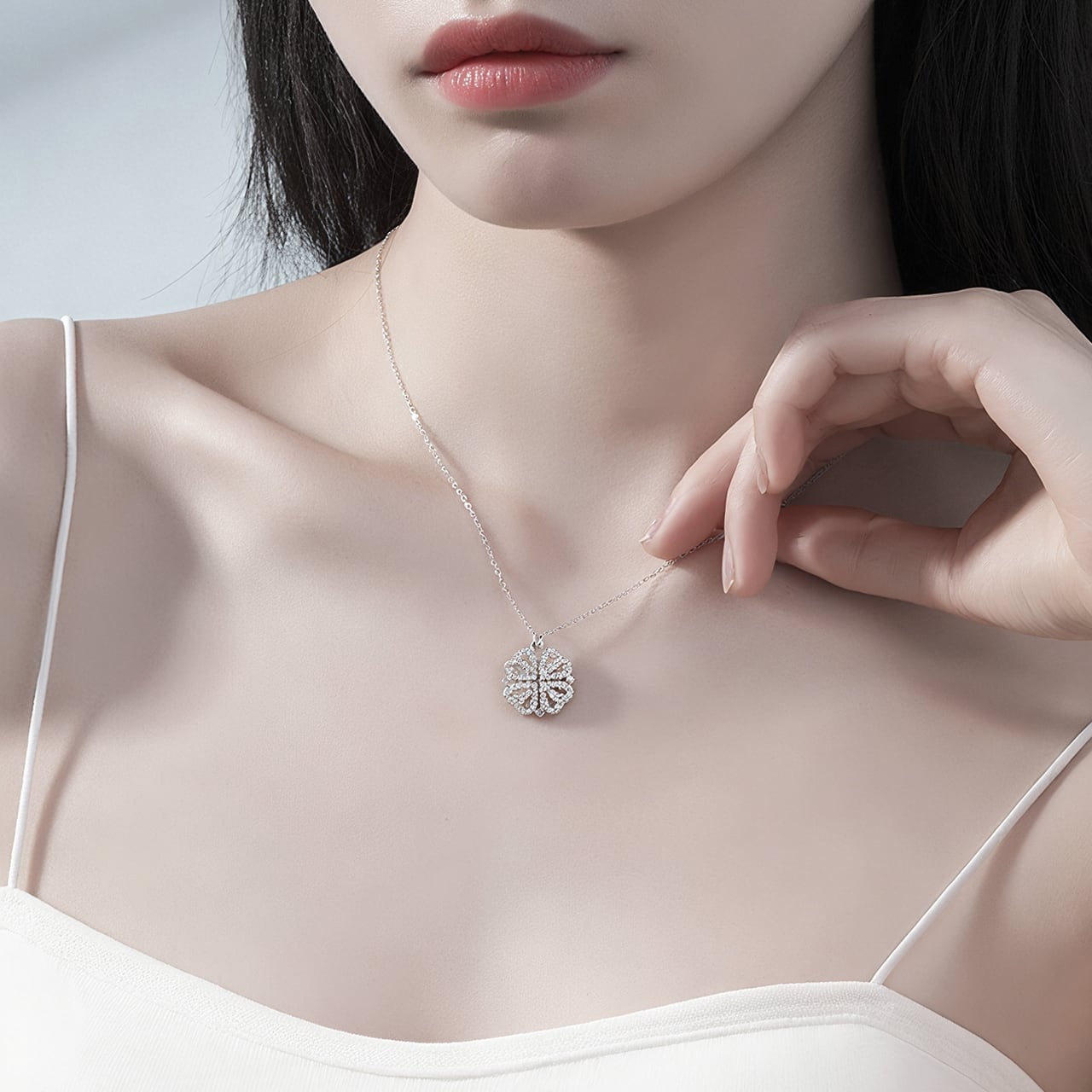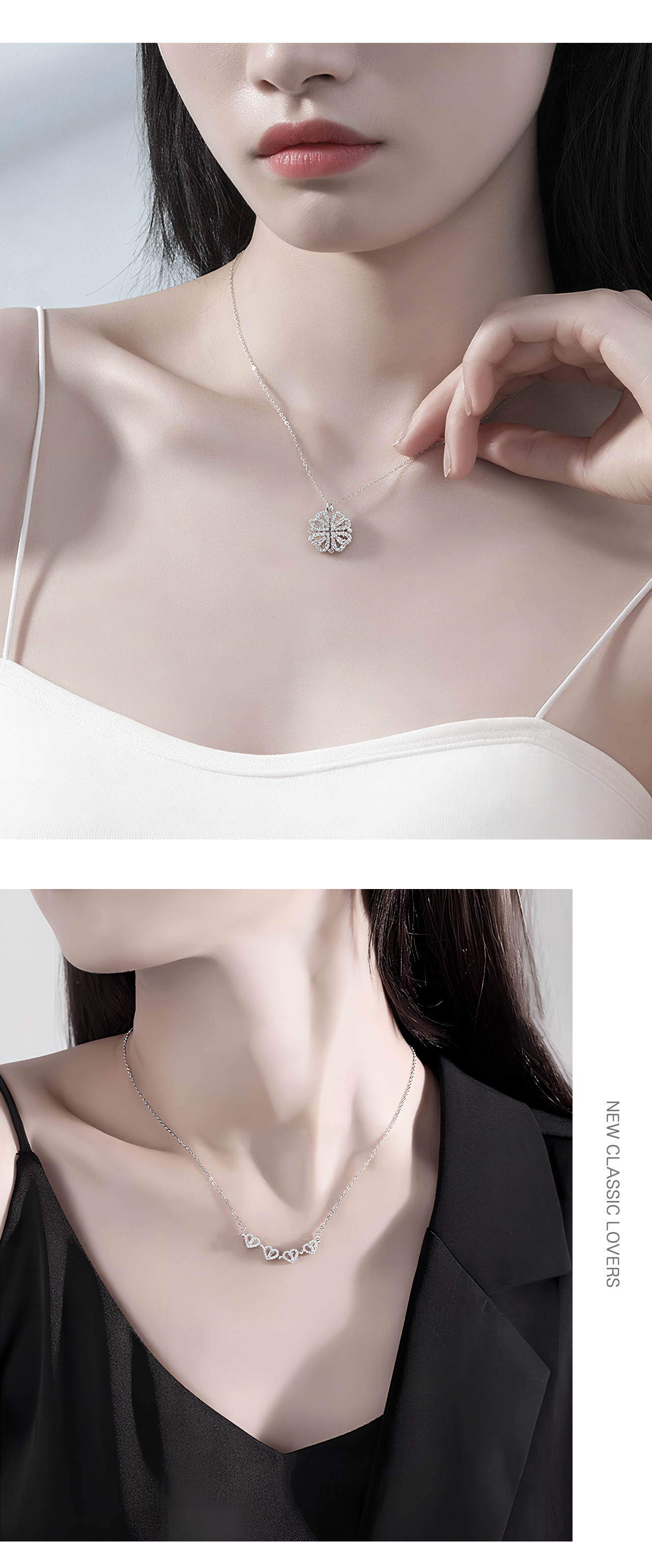 B79 .マグネット式2WAY着用 ハート型 四つ葉クローバーネックレス ▼ S925銀製 人工ジルコニウム装飾