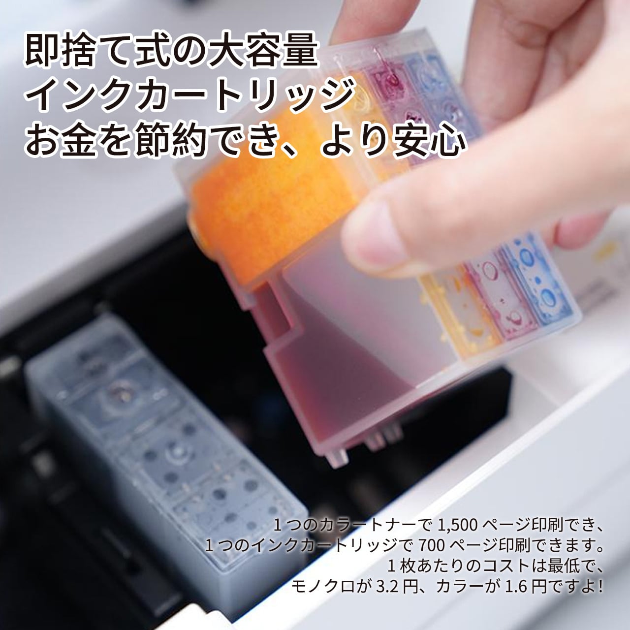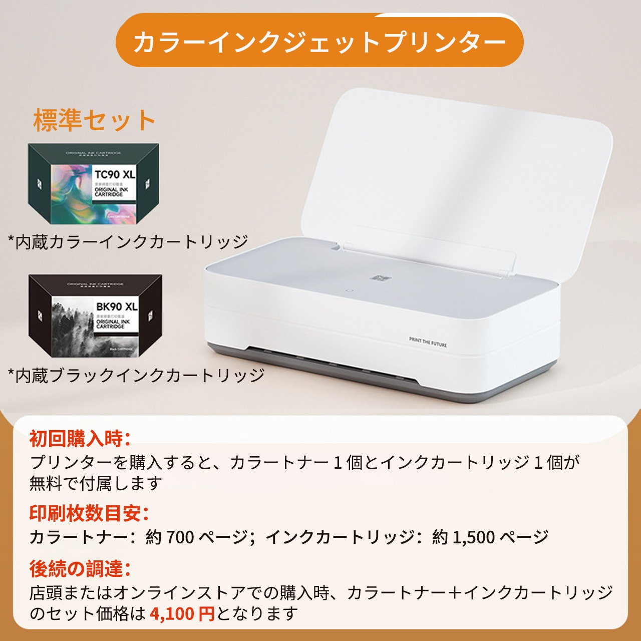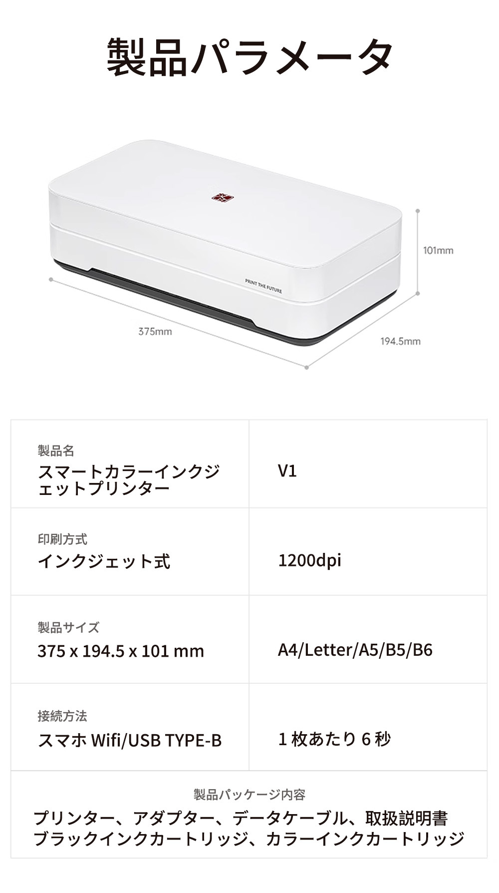 ■ 製品パッケージ内容:プリンター、アダプター、データケーブル、取扱説明書 ブラックインクカートリッジ、カラーインクカートリッジ