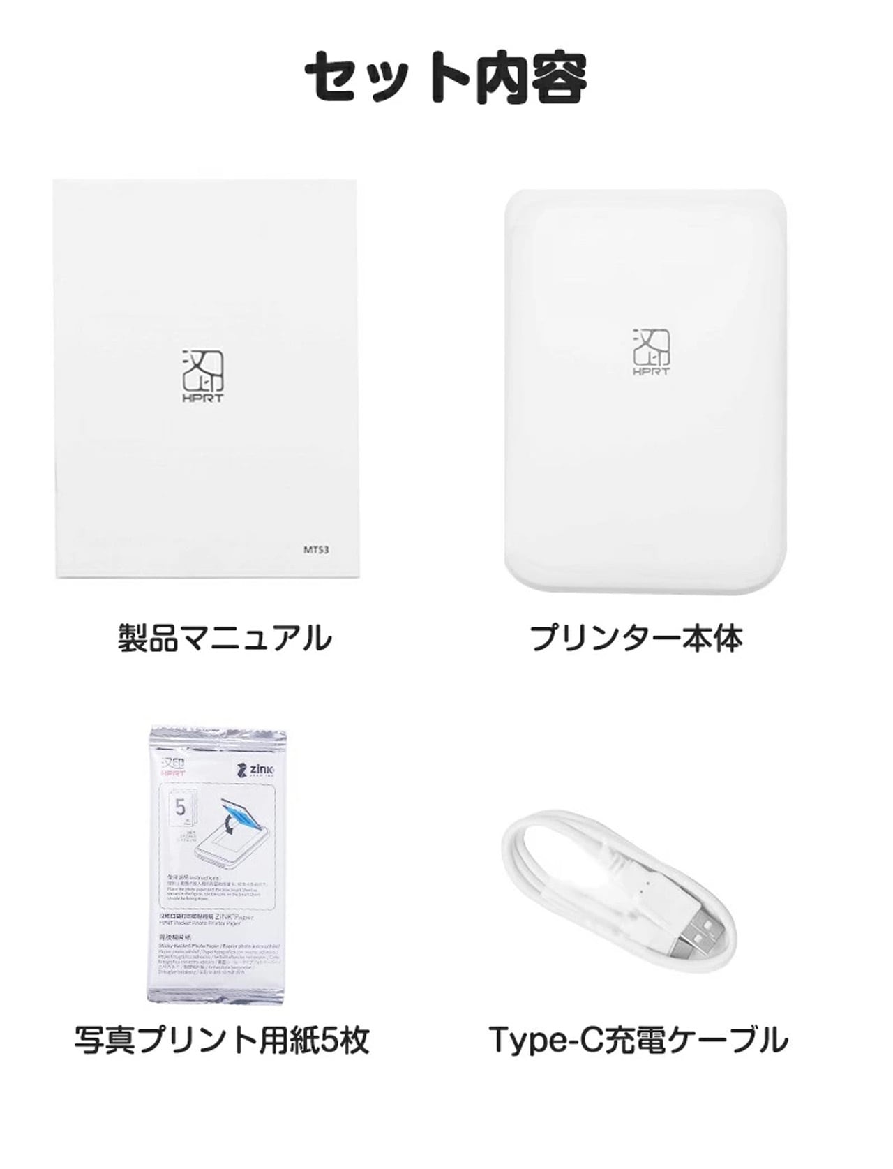 フォトプリンター本体*1、プリント用紙*5枚、Type-C充電ケーブル*1、取扱説明書*1、パッケージ*1