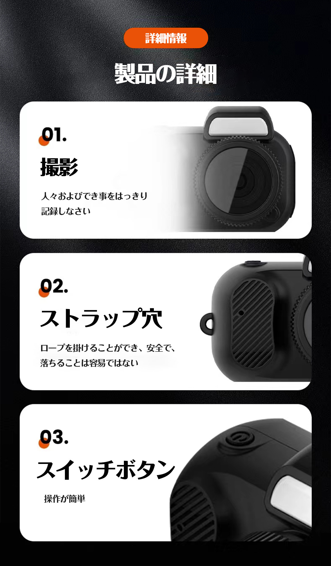 → コイン並みの軽さで、ネックレス・アクセサリー・キーホルダーに偽装可能。自然な瞬間を気軽に残せます