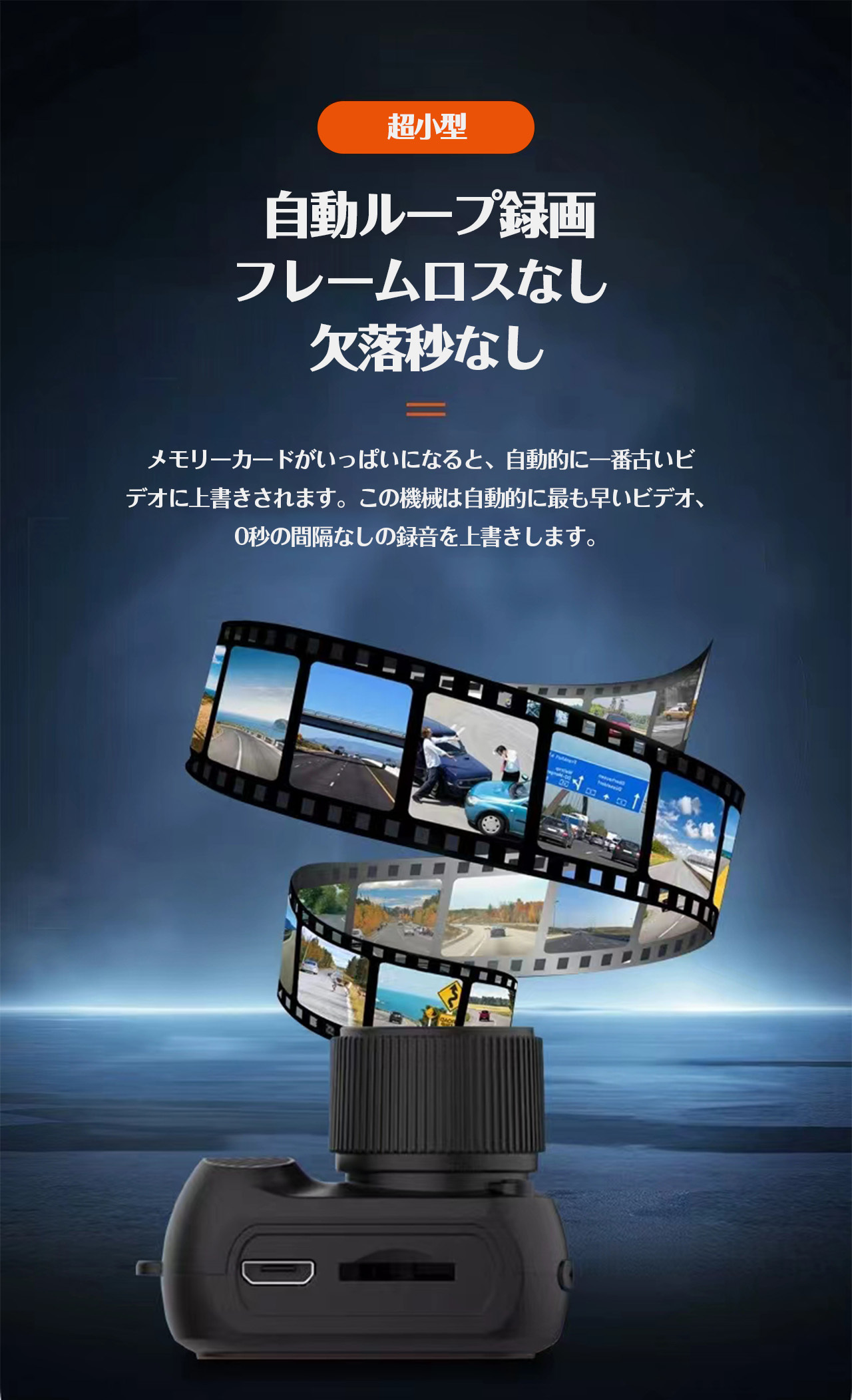 従来は容量がいっぱいになると録画停止 → 大事なシーンを残せない → 自動ループ録画に対応。容量満了時は古いデータを上書き、途切れず安心して使用できます