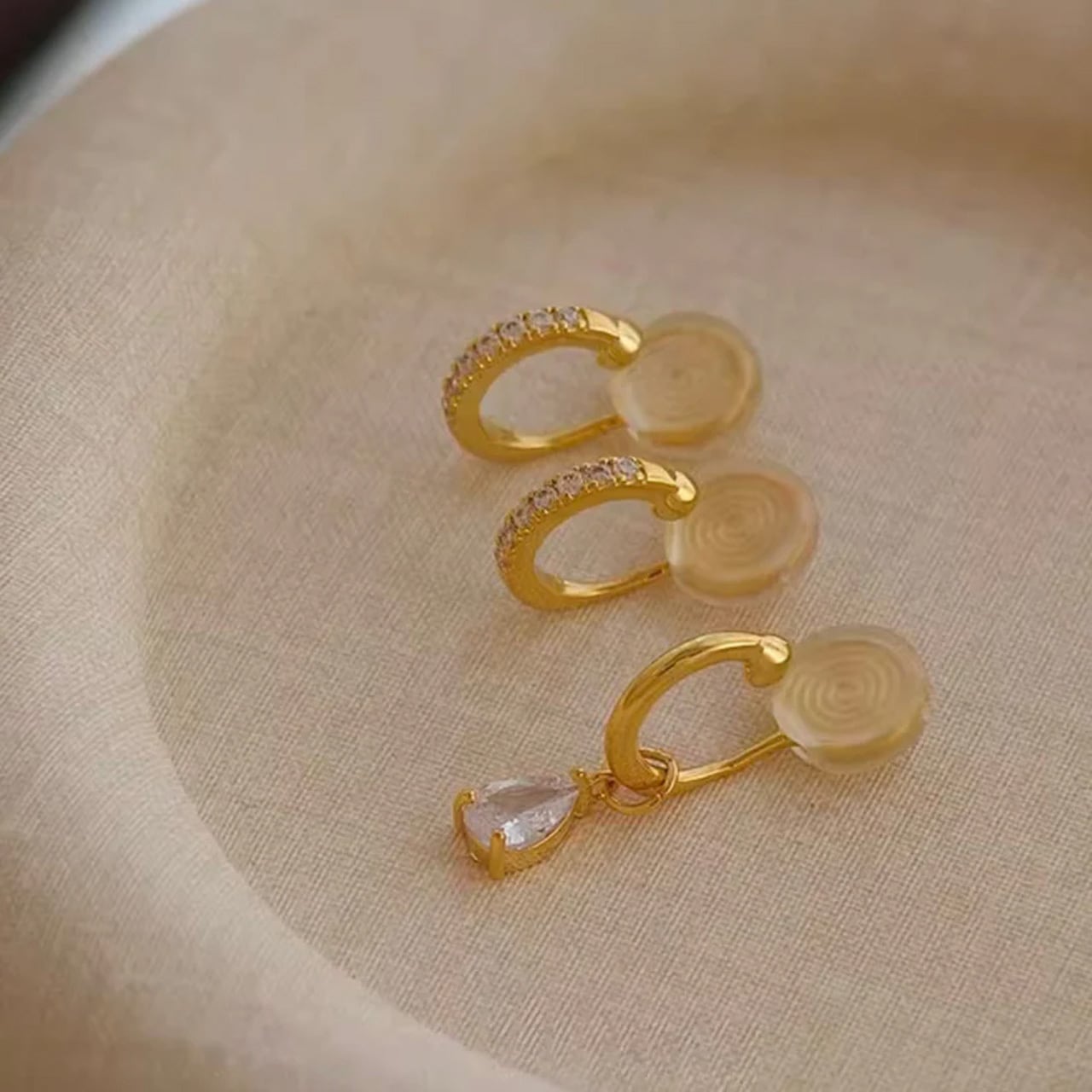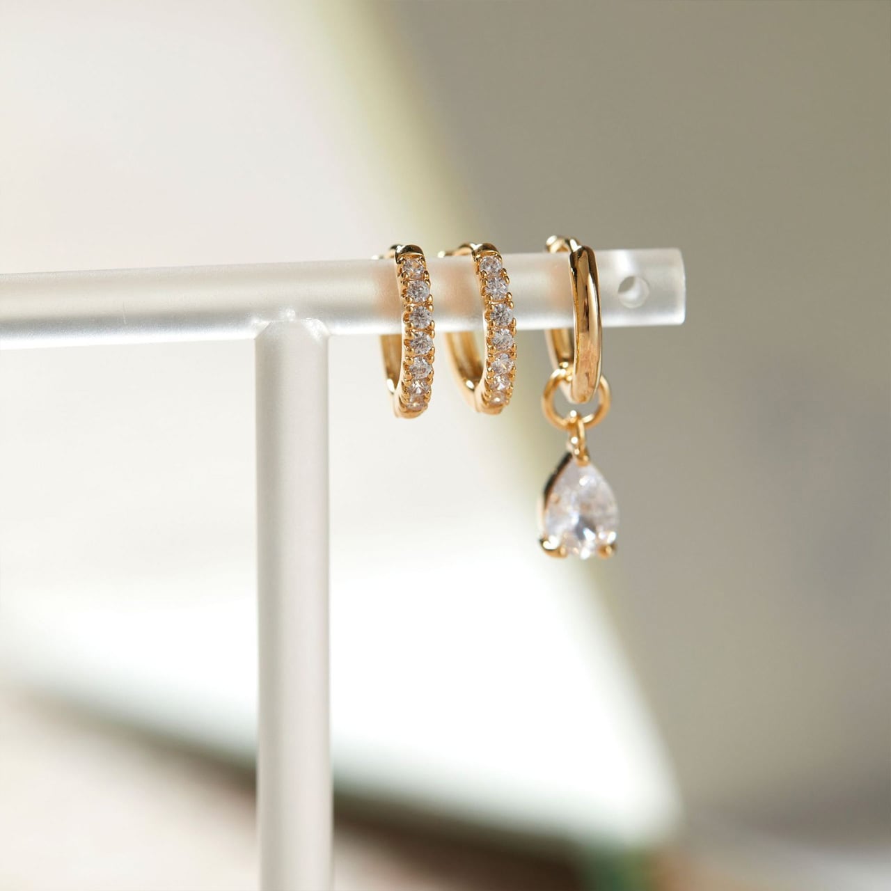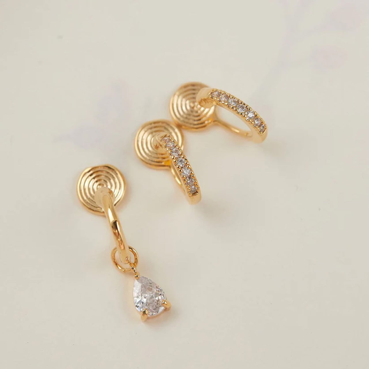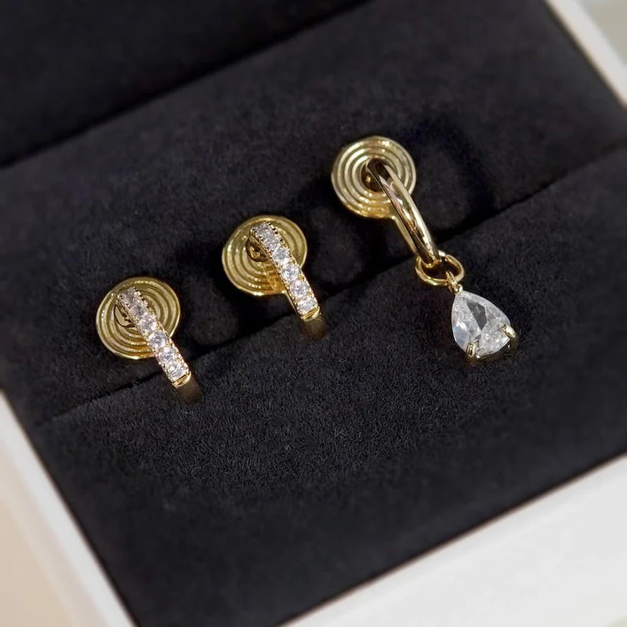 2つのフープは繊細なキュービックジルコニアが贅沢に敷き詰められ、耳元で繊細に光を反射します。