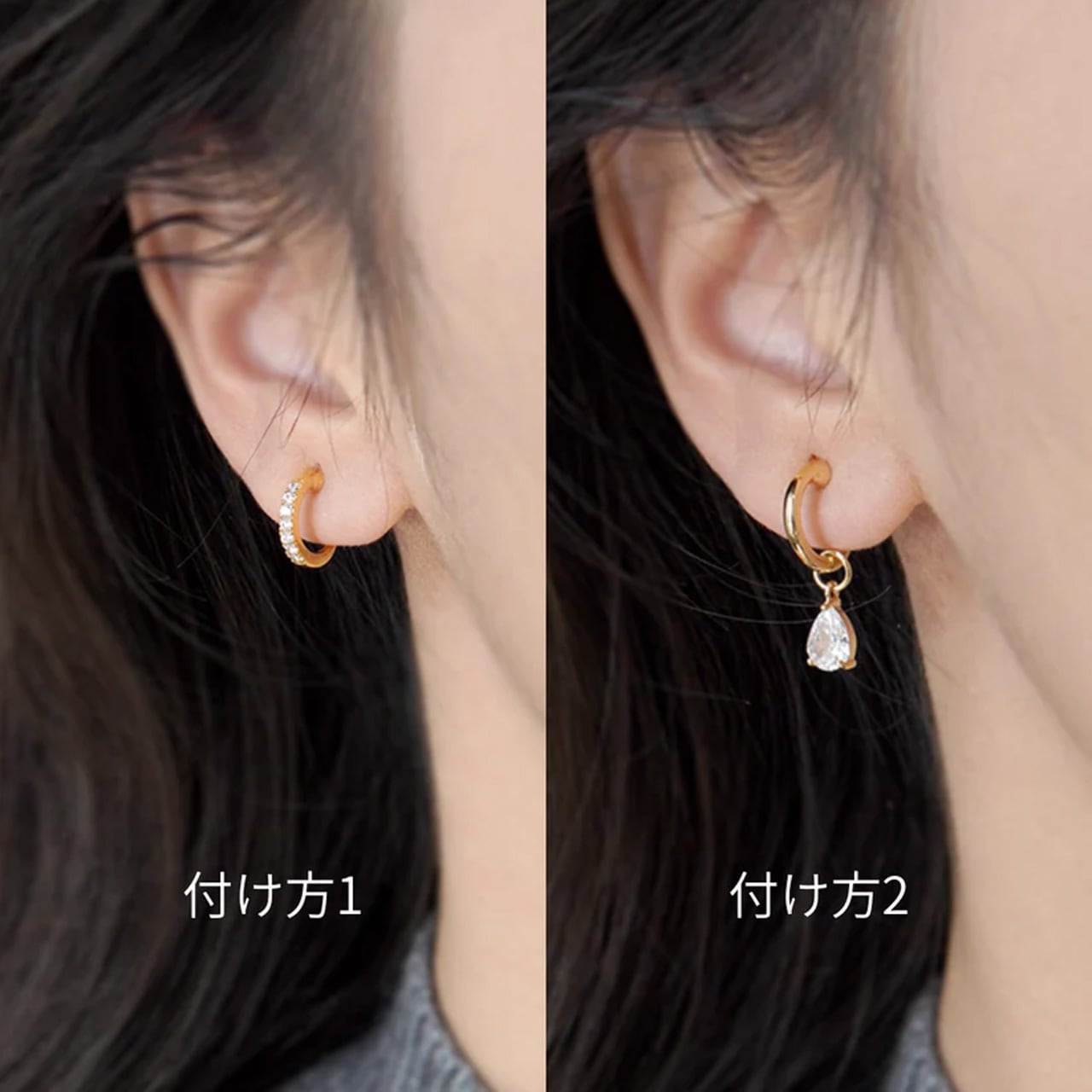 もう1つは雫のようにきらめくドロップ型のストーンが揺れ、上品さと女性らしさをプラス。