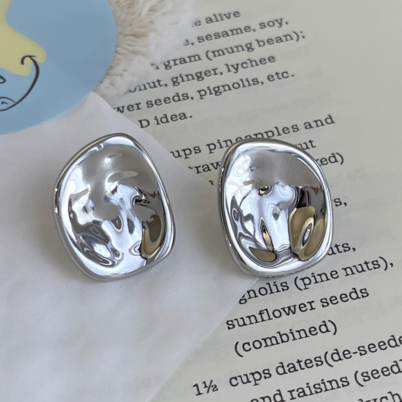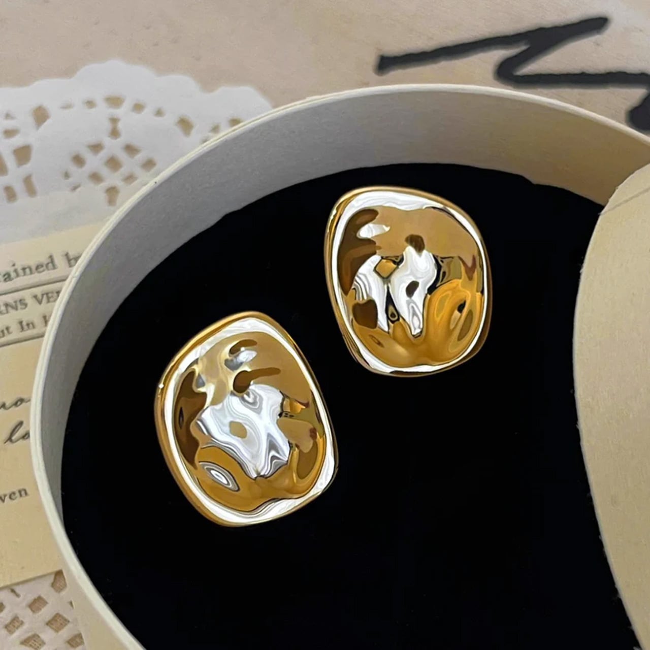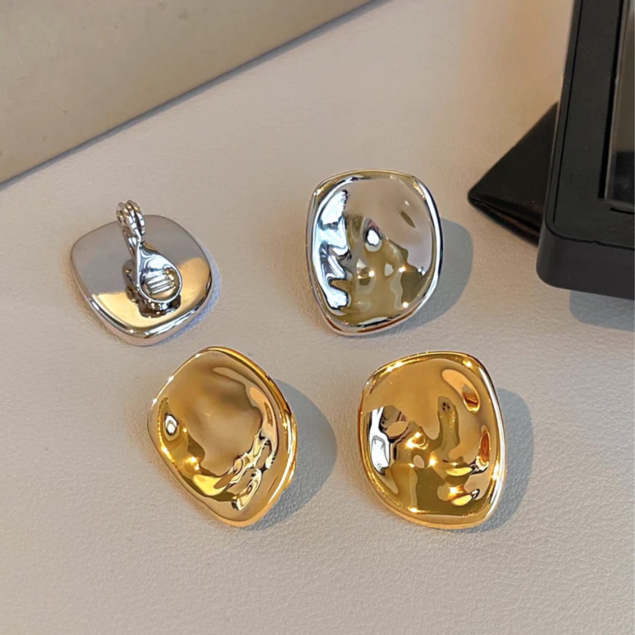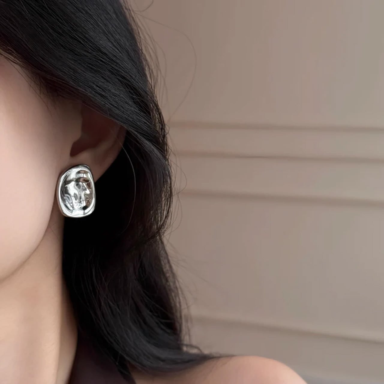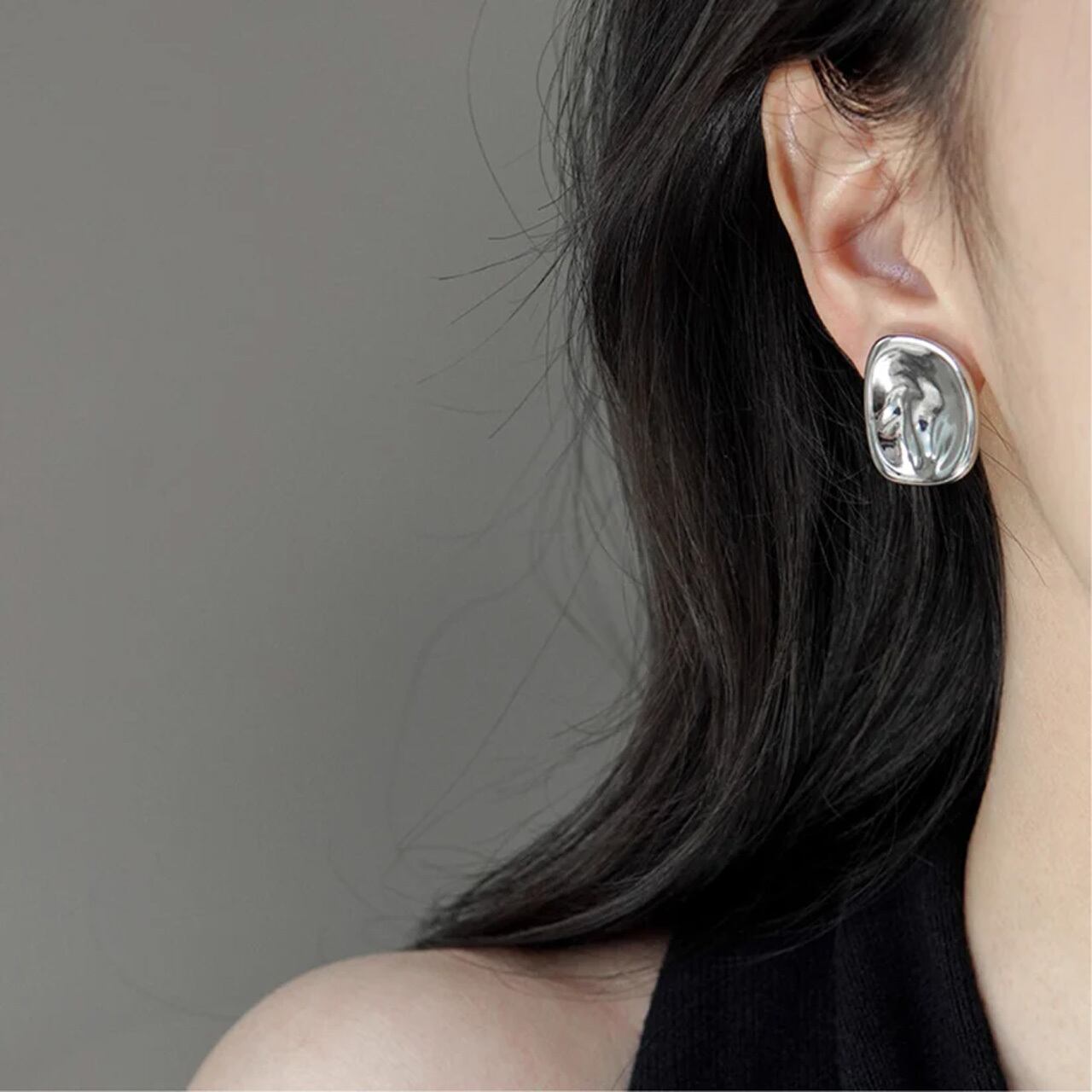 艶やかなメタルの表面が、光を柔らかく反射し、顔まわりにモダンでこなれた印象を与えます。 シンプルながらも、いびつなニュアンスのある形が確かな存在感を放ち、コーディネートのアクセントに。