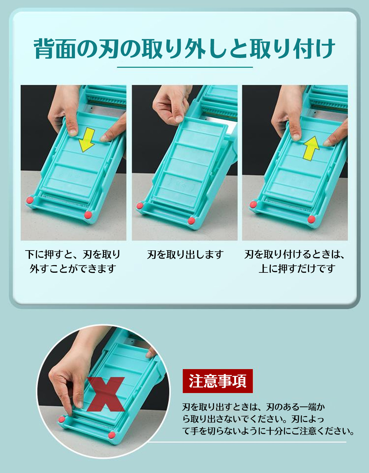 注意:刃は鋭いため、使用時は必ず手保護装置を併用してください。手をけがしないように十分にご注意ください。