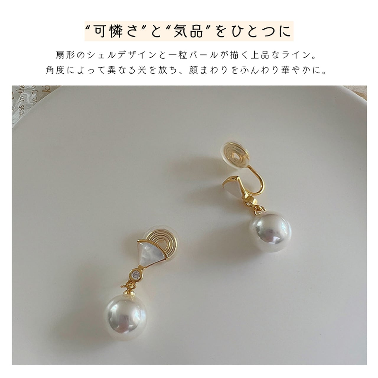柔らかく光るホワイトパールと、扇形のシェルデザインが調和した繊細なデザイン。