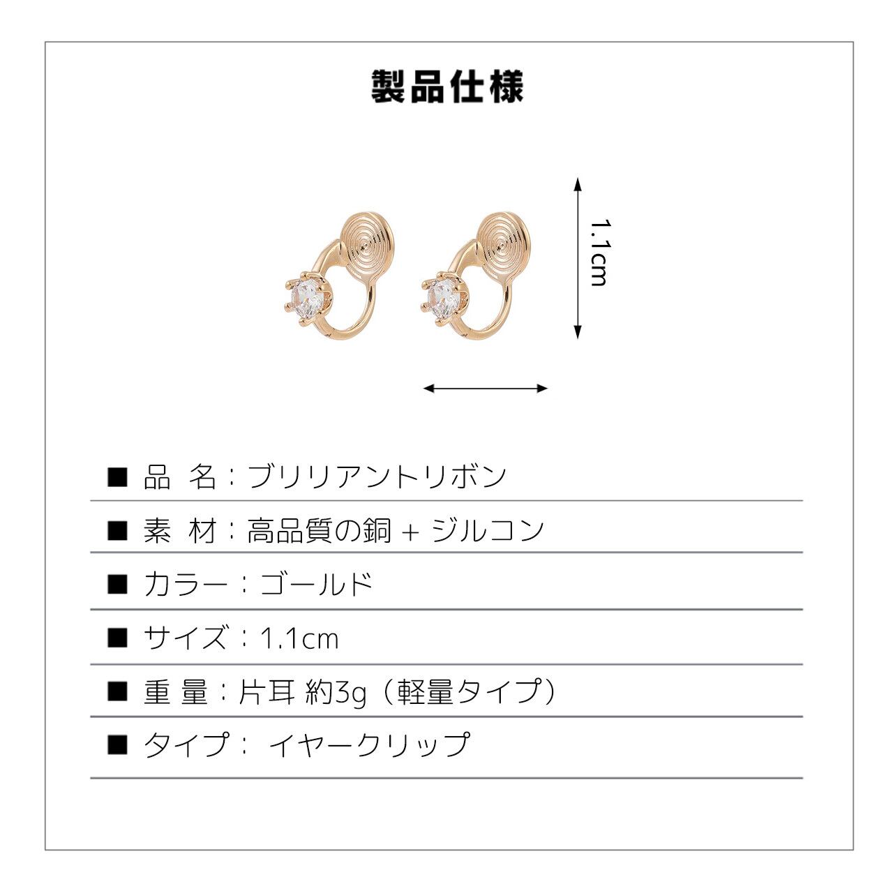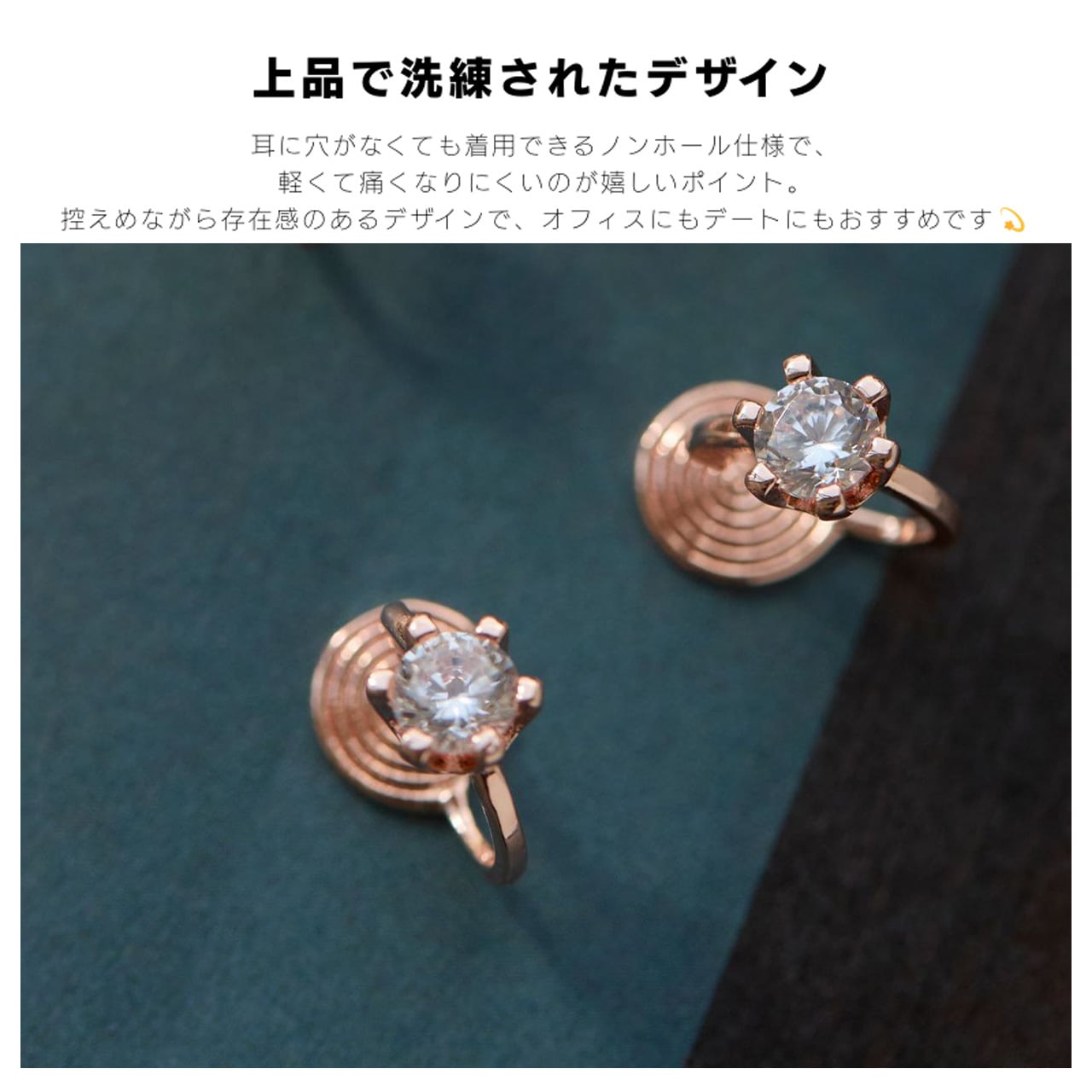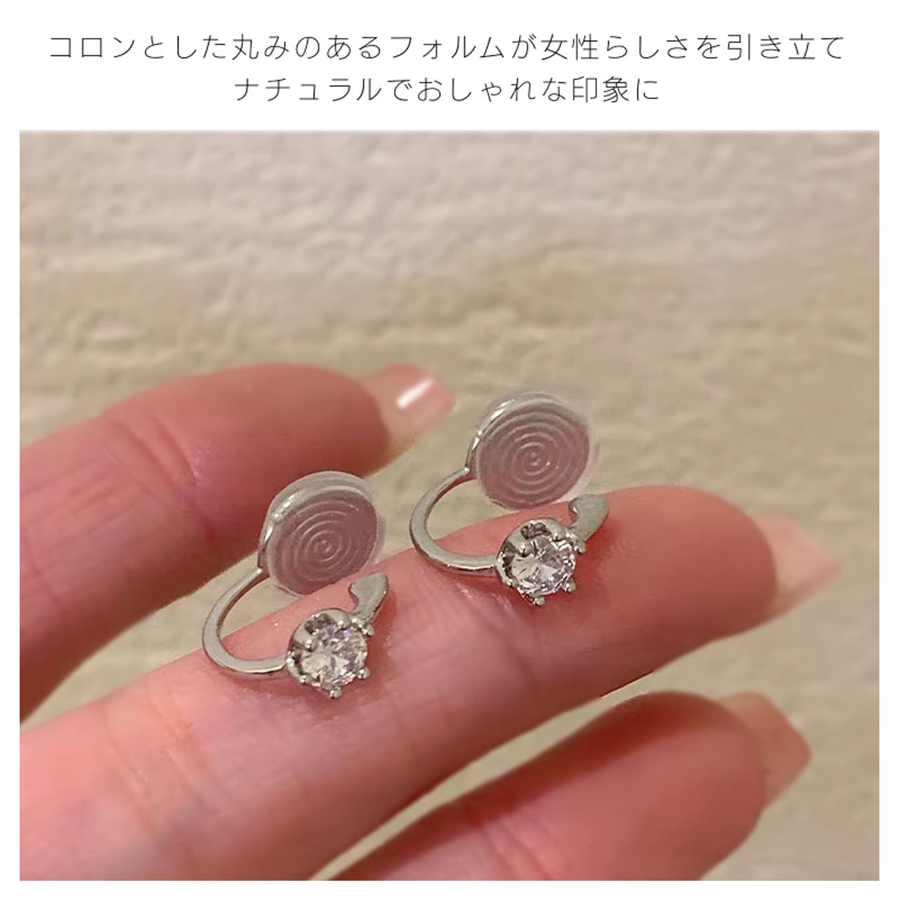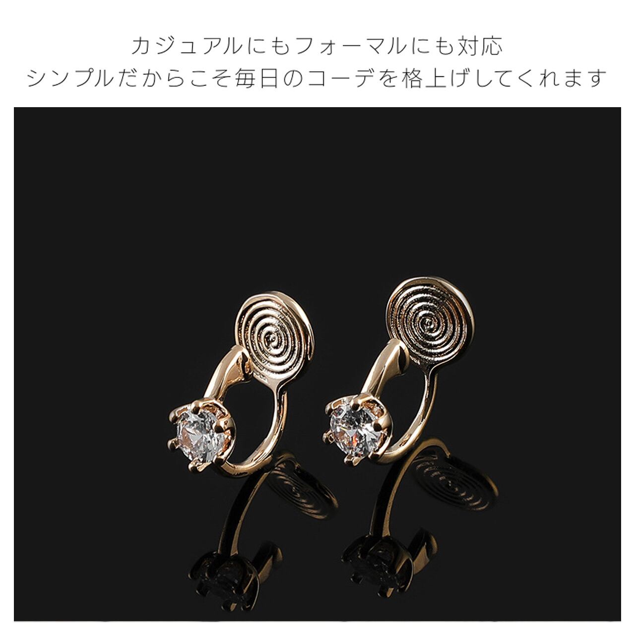 ・丸く輝くジルコンを金属の台座に爪留めし、強い光沢と上品な雰囲気を演出します。コーディネートにさりげないアクセントを加え、ピアスホールがなくても違和感なく着用できます。