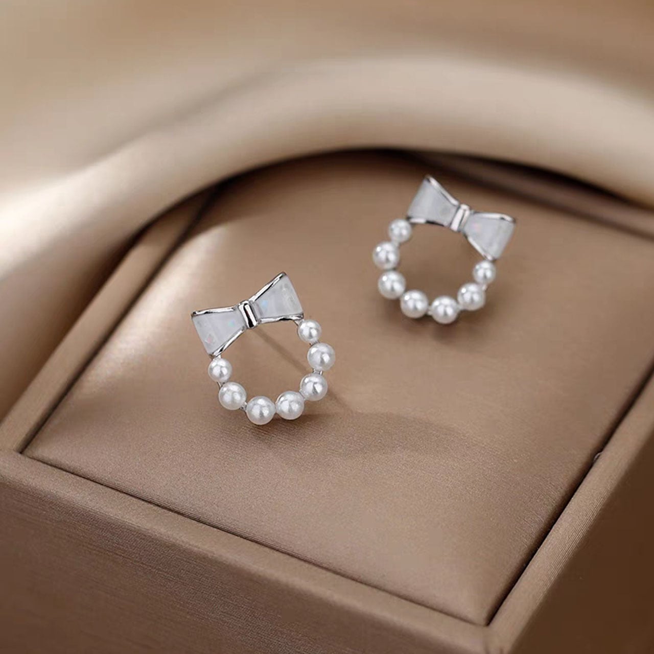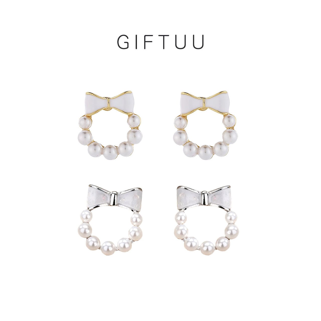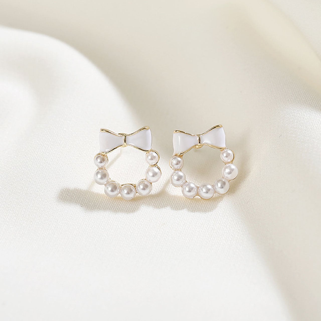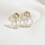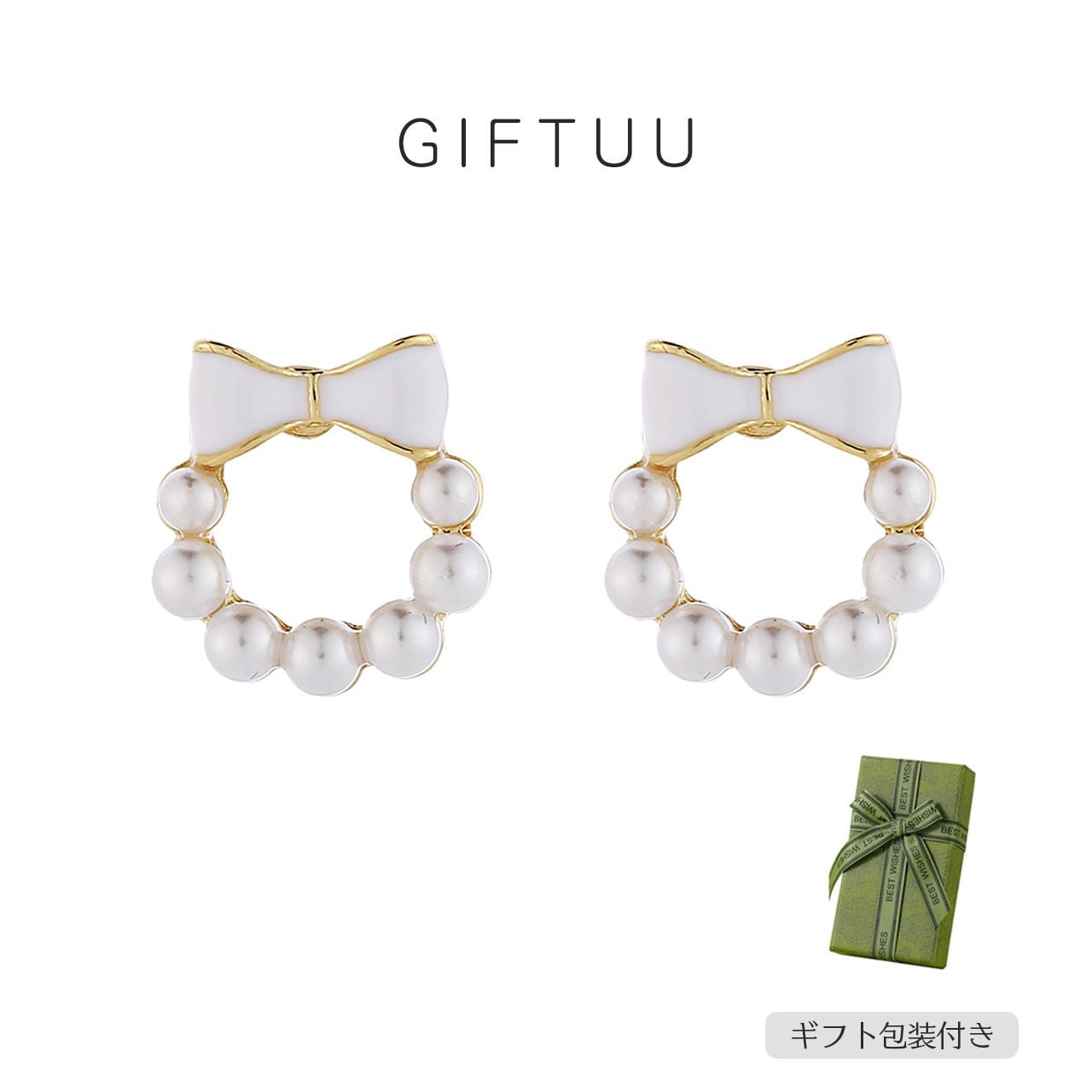 ・複数のホワイトパールを半円状にあしらったリースは、リボンとシームレスに一体化され、シンプルながらも洗練された魅力を放ちます。