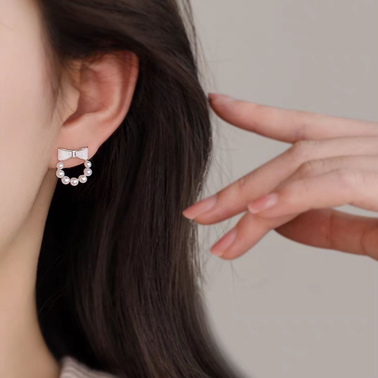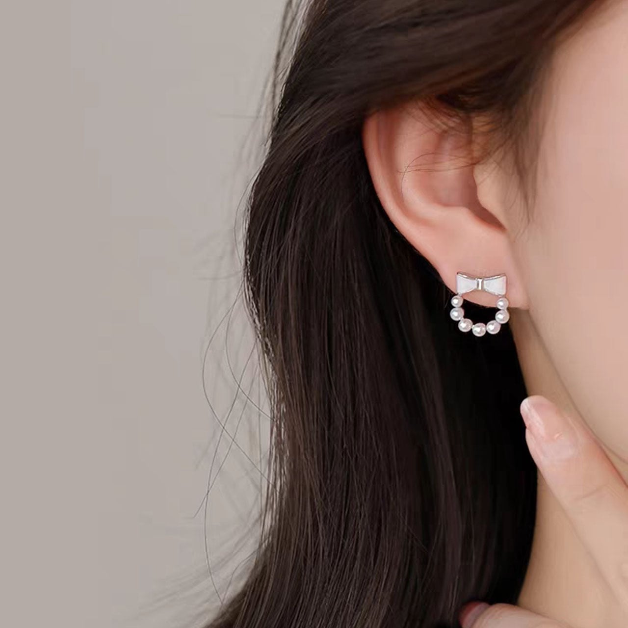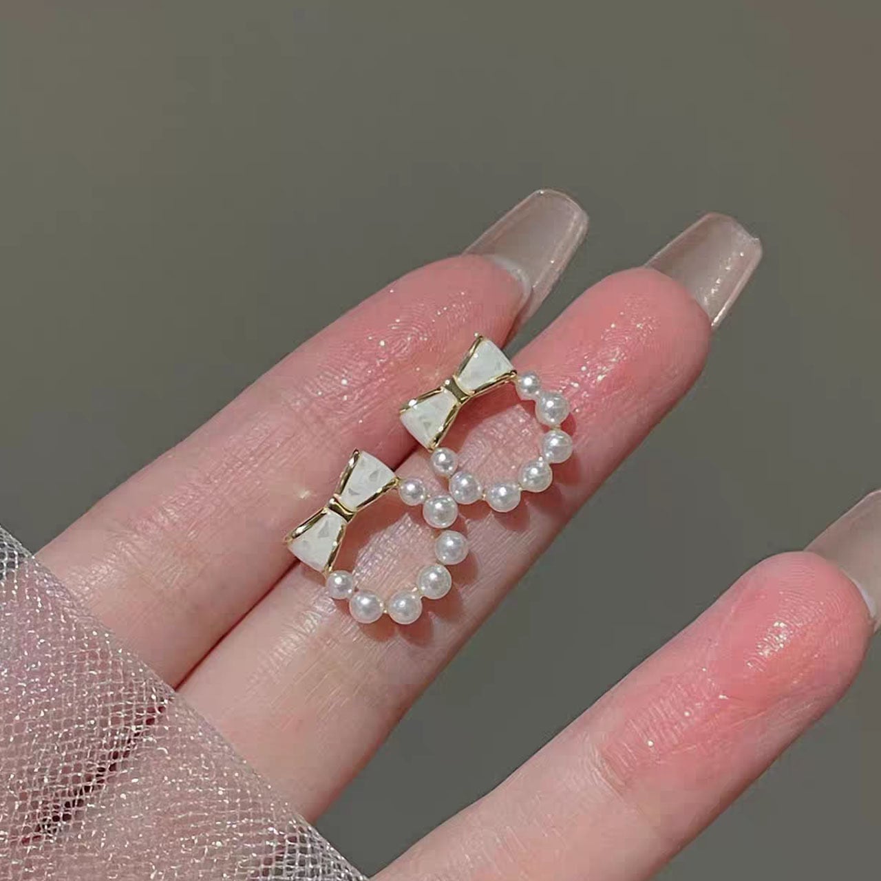 ・可憐な蝶のモチーフとパールの連なりがエレガントな雰囲気を添え、パールの柔らかな光沢が顔色を明るく引き立てます。