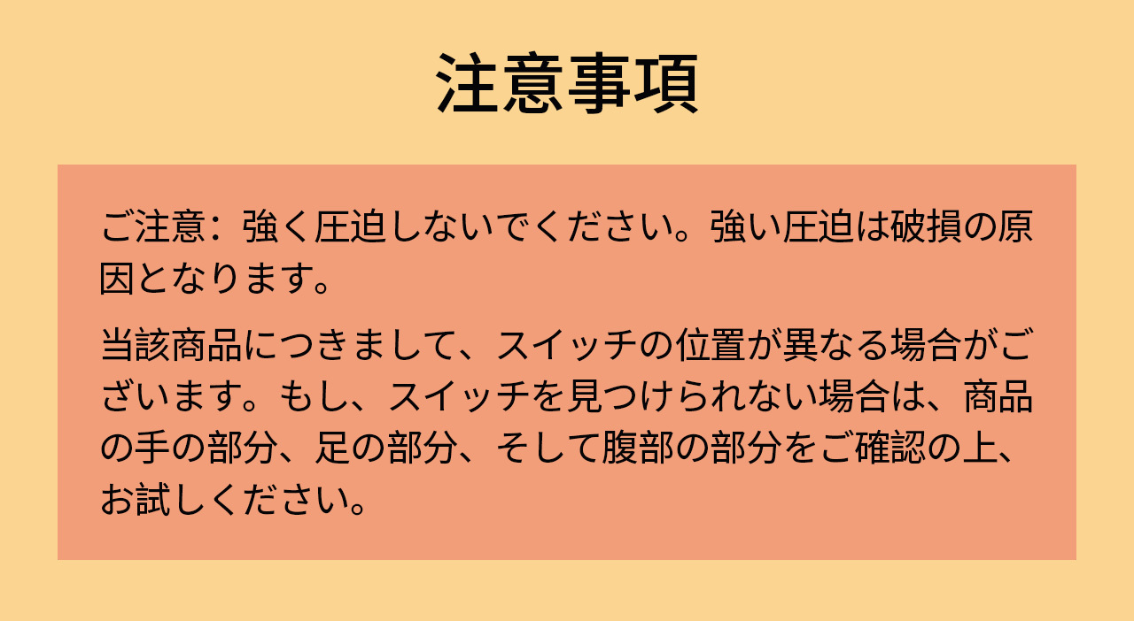 当該商品につきまして、スイッチの位置が異なる場合がございます。もし、スイッチを見つけられない場合は、商品の手の部分、足の部分、そして腹部の部分をご確認の上、お試しください。