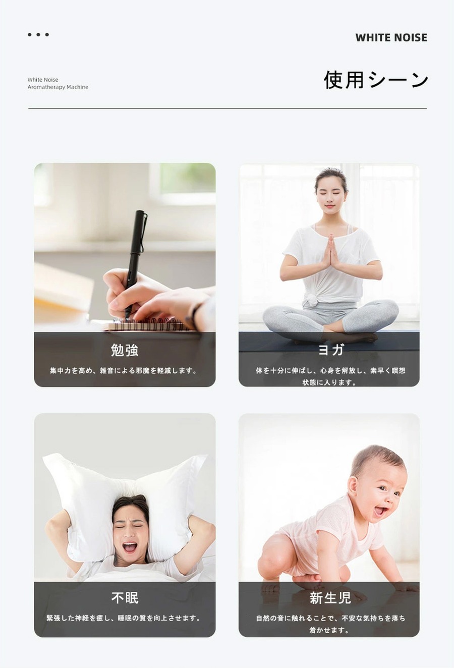 寝室を快適でリラックスできる空間にしたい方におすすめ。ホワイトノイズで静かな眠りをサポートし、ナイトライトで寝室の雰囲気を落ち着かせます。加湿機能も搭載しており、乾燥が気になる季節にも最適。毎晩の睡眠が改善され、朝の目覚めがスッキリします。睡眠不足解消にも効果的なアイテムです。