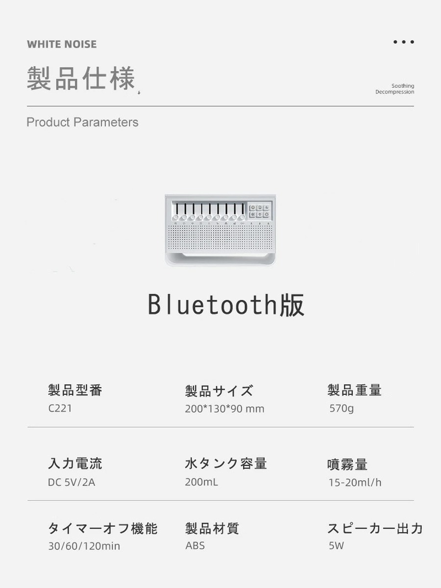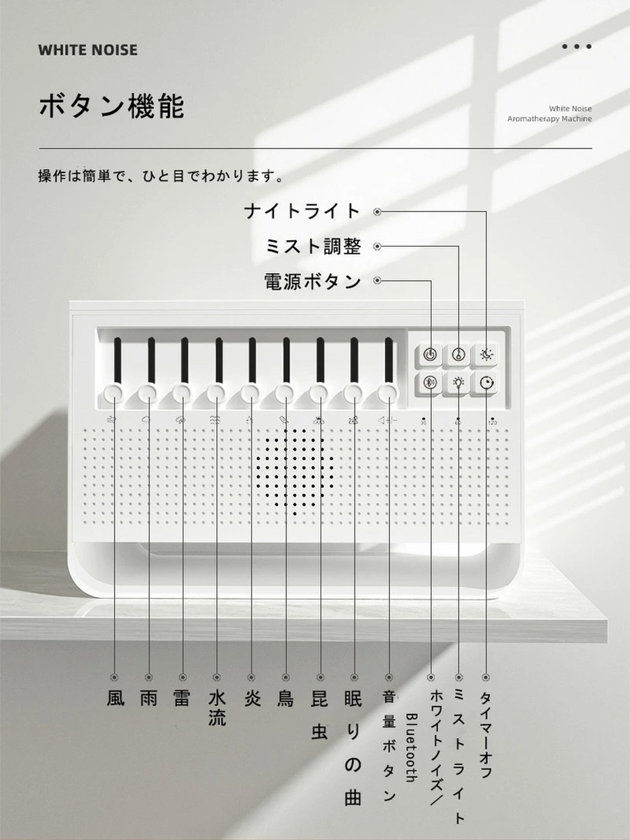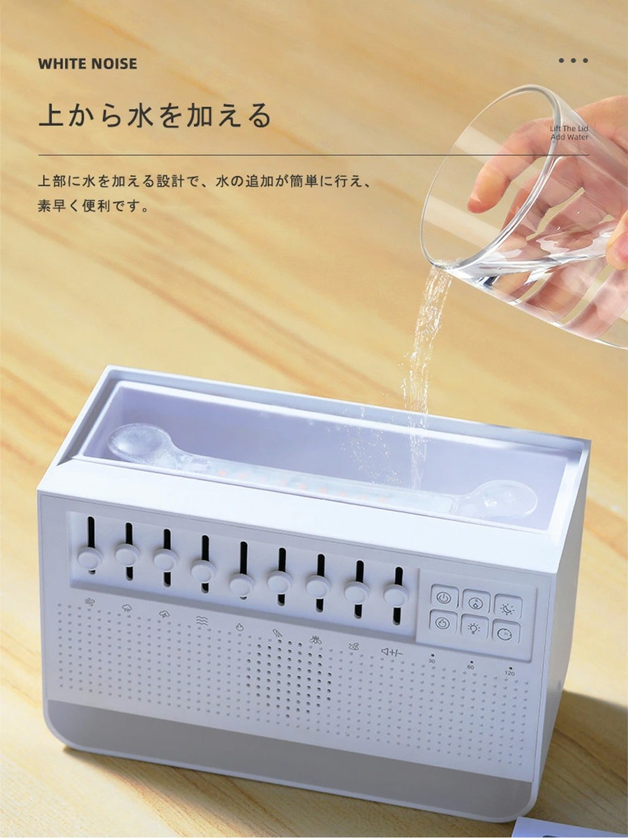 忙しい日々を過ごしているあなたにぴったりのアイテムです。このホワイトノイズアロマディフューザーは、ナイトライト、ホワイトノイズ、アロマの3in1機能を搭載し、寝室をリラックスできる空間に変えます。Bluetooth接続対応で、お好きな音楽を簡単に流せるので、寝室での睡眠改善に最適。ぐっすり眠れて、朝の目覚めも爽快です。
