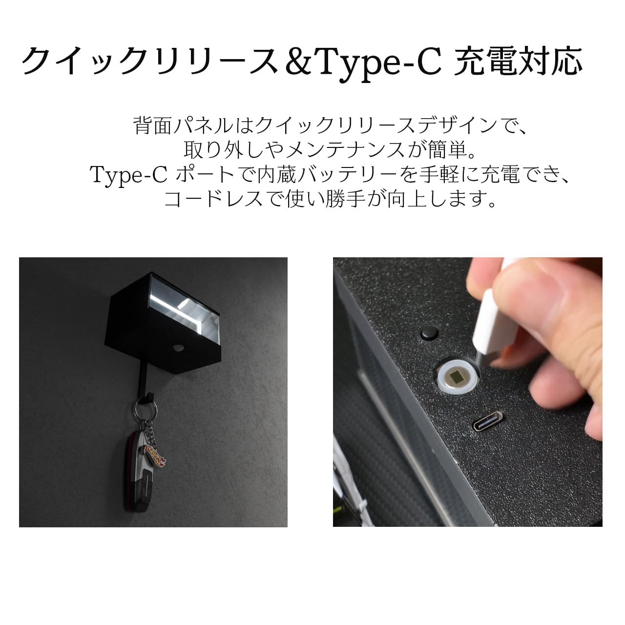 背面パネルはクイックリリースデザインで、取り外しやメンテナンスが簡単。Type-C ポートで内蔵バッテリーを手軽に充電でき、コードレスで使い勝手が向上します。