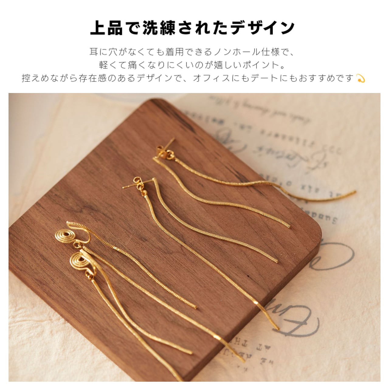 この「質感フリンジロングイヤリング」は、ミニマルデザインに高級な金属光沢を融合させ、耳元で優雅に揺れるフリンジが、一歩上の大人の雰囲気を演出します。ピアスホールのない方でも安心して着用できるモスキートコイルイヤークリップ款と、ホールのある方に便利なピアス款の 2 種類を用意。日常のカジュアルコーデから、ディナーやパーティーといった特別な場面まで、幅広いシーンで活躍する万能アイテムです。