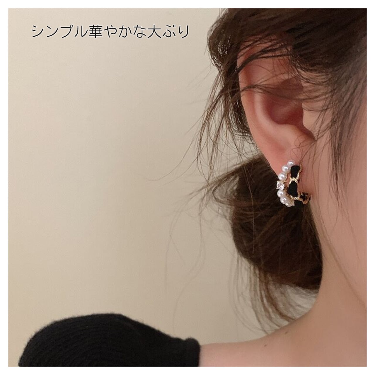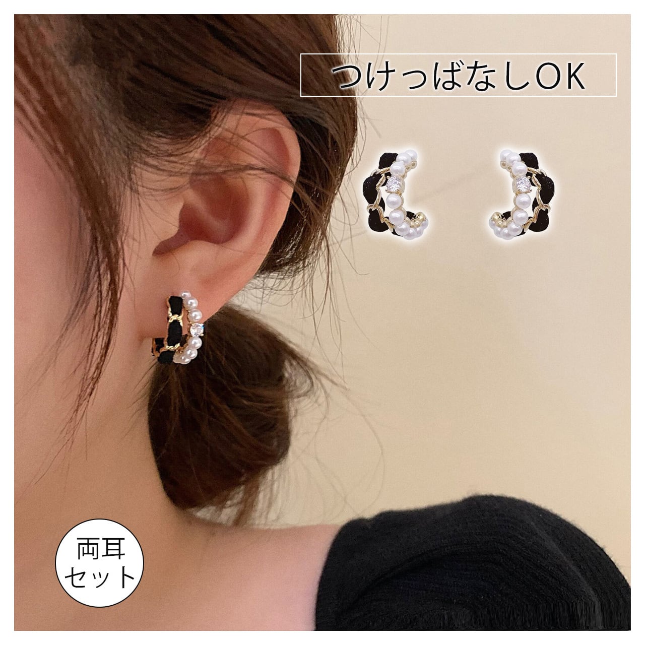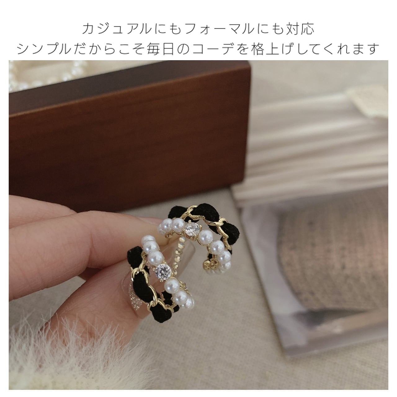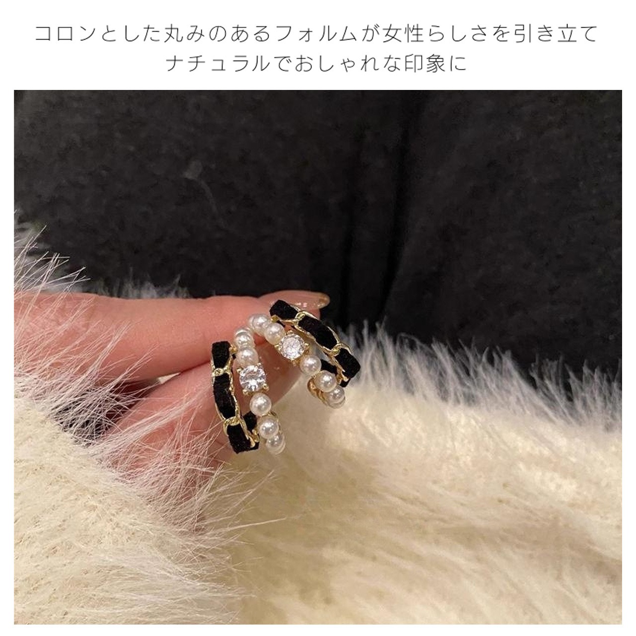 シンプルなC型シルエットが耳元を優しく包み込み、顔のラインを引き締める効果があります。ブラックベロアの柔らかい質感が手作りの温もりを伝え、中央に配置された真珠は上品な光沢を放ち、過度な華やかさを避けつつ存在感を演出します。