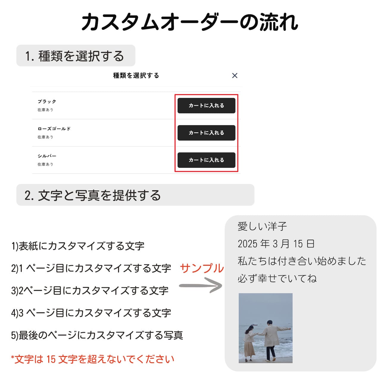 購入後、印刷していただきたい写真、テキスト、および注文番号をお送りいただければ、写真に基づいて制作させていただきます。