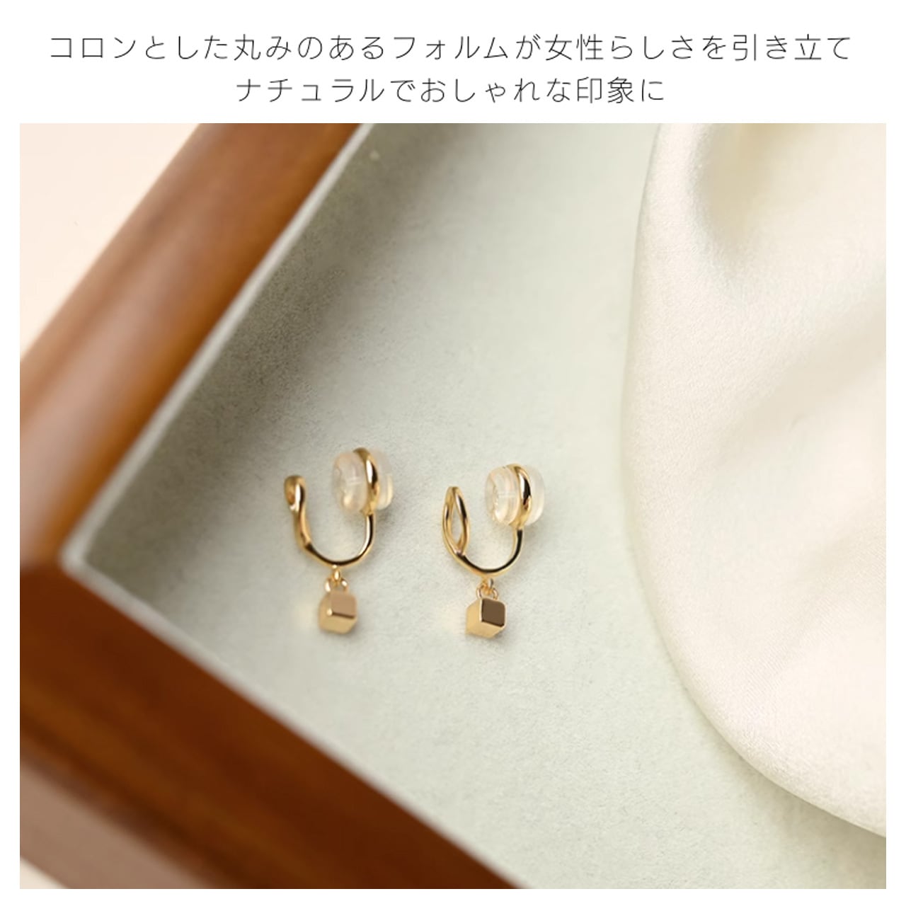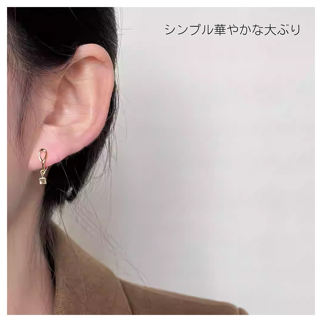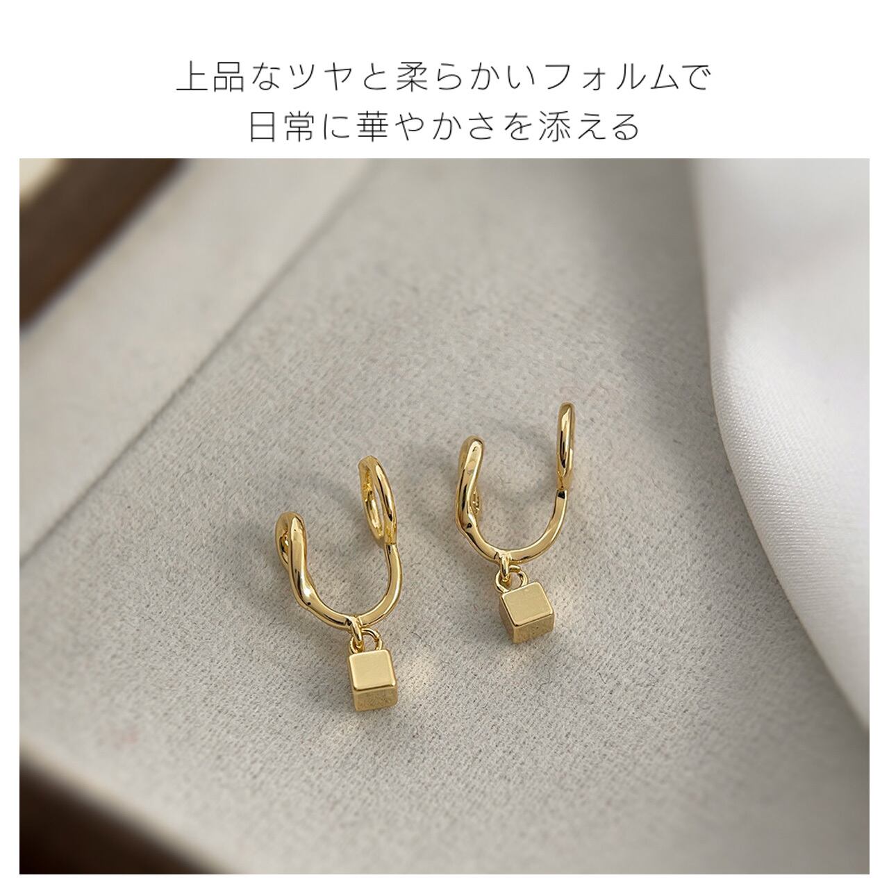 ペンダント式のデザインで、耳元に自然な垂れ感を添え、顔のラインを引き締めてくれます;