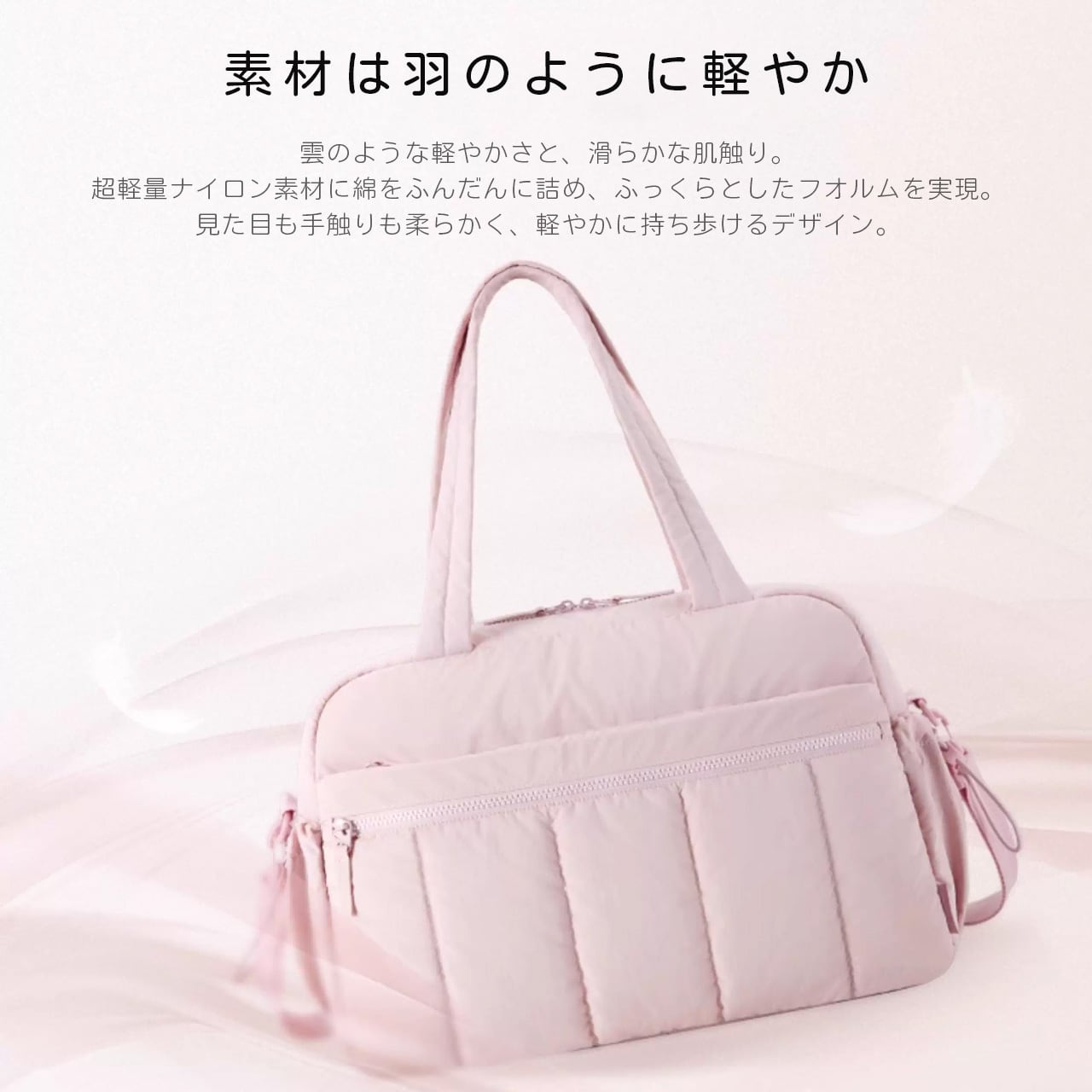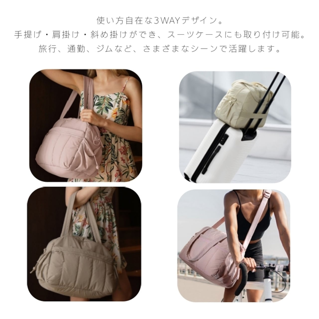 手提げ・肩掛け・斜め掛け対応。さらにキャリーケース固定ベルト付きで旅行にも便利。