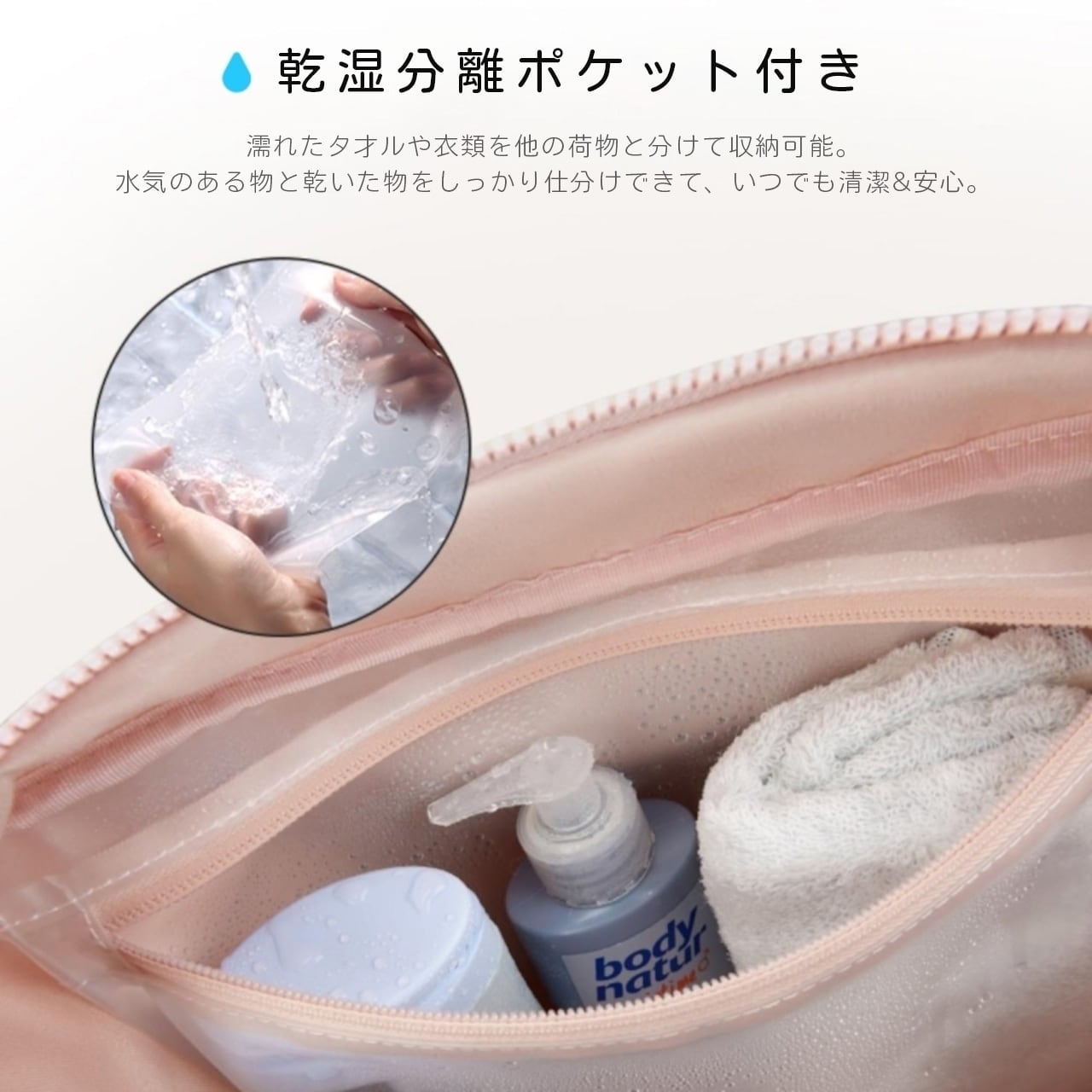 濡れたタオルやボトルを分けて収納できる「乾湿分離層」で、衛生的に使えます。