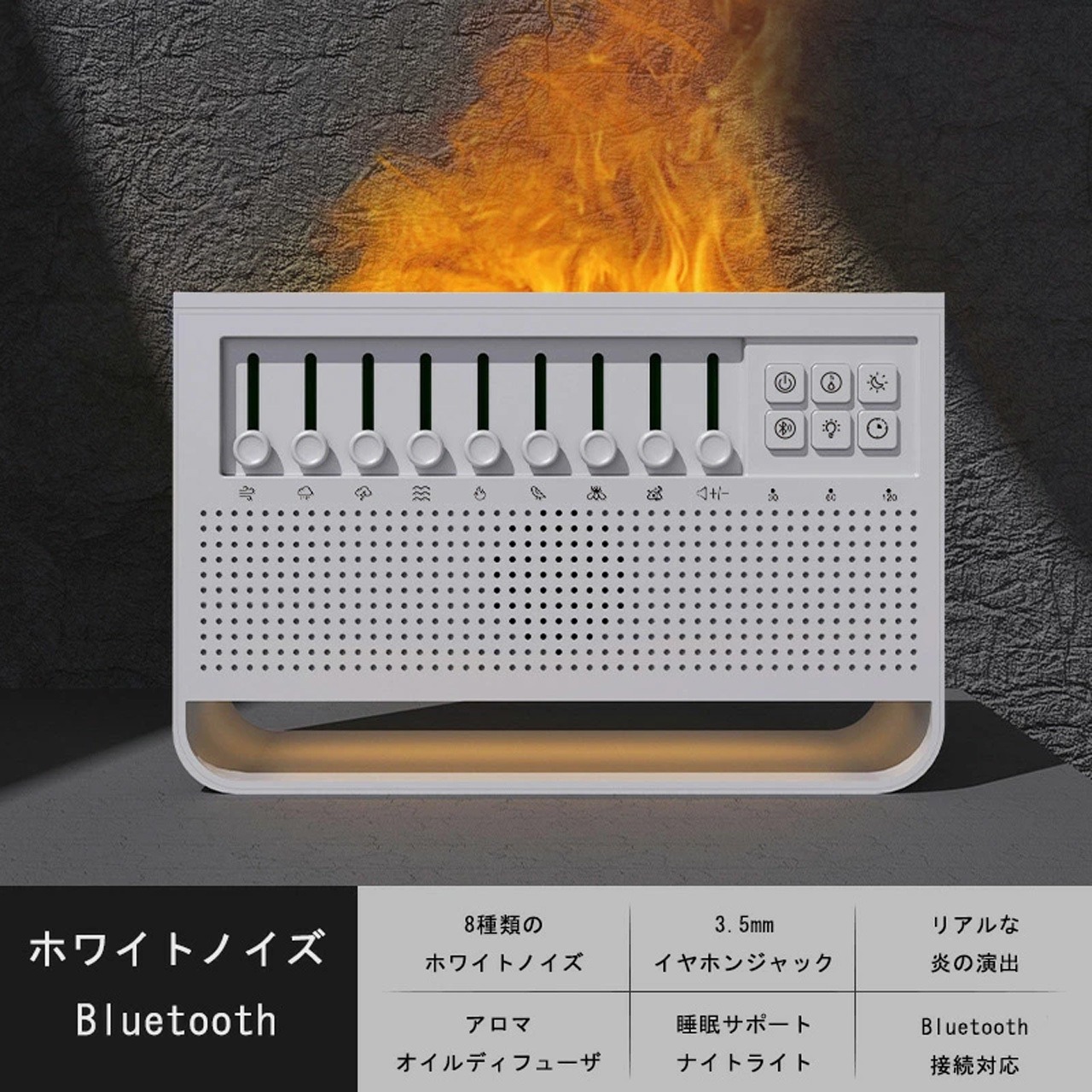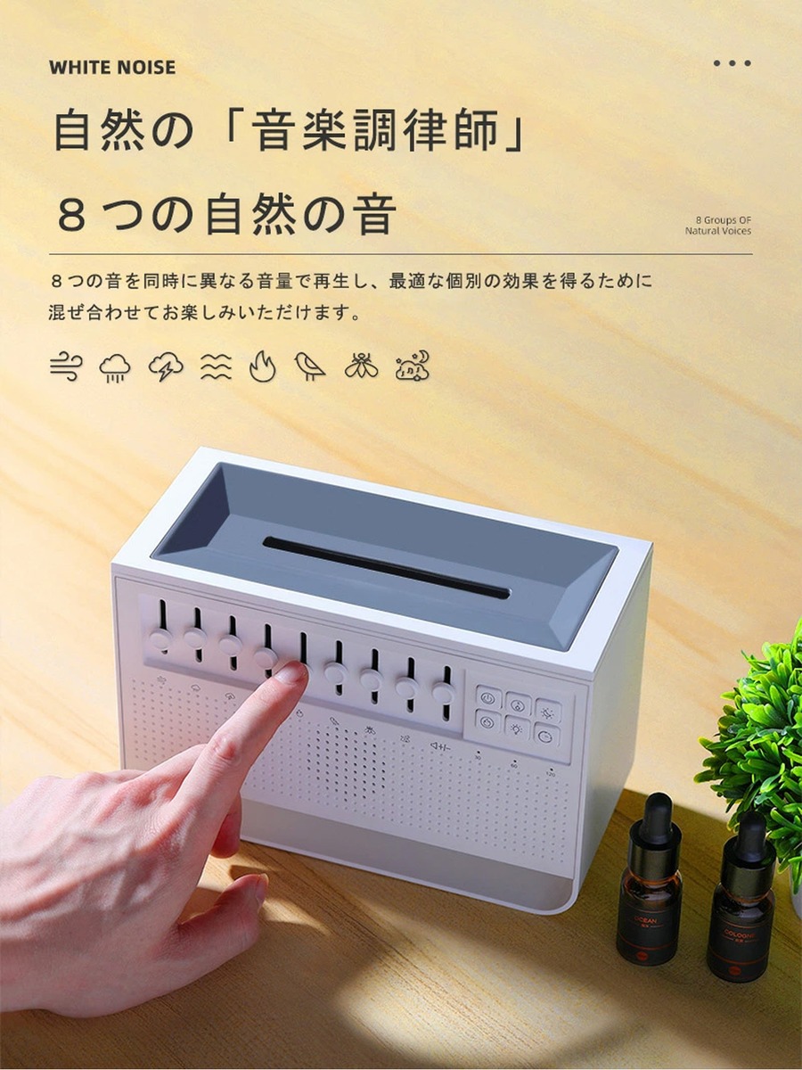 忙しい日々を過ごしているあなたにぴったりのアイテムです。このホワイトノイズアロマディフューザーは、ナイトライト、ホワイトノイズ、アロマの3in1機能を搭載し、寝室をリラックスできる空間に変えます。Bluetooth接続対応で、お好きな音楽を簡単に流せるので、寝室での睡眠改善に最適。ぐっすり眠れて、朝の目覚めも爽快です。