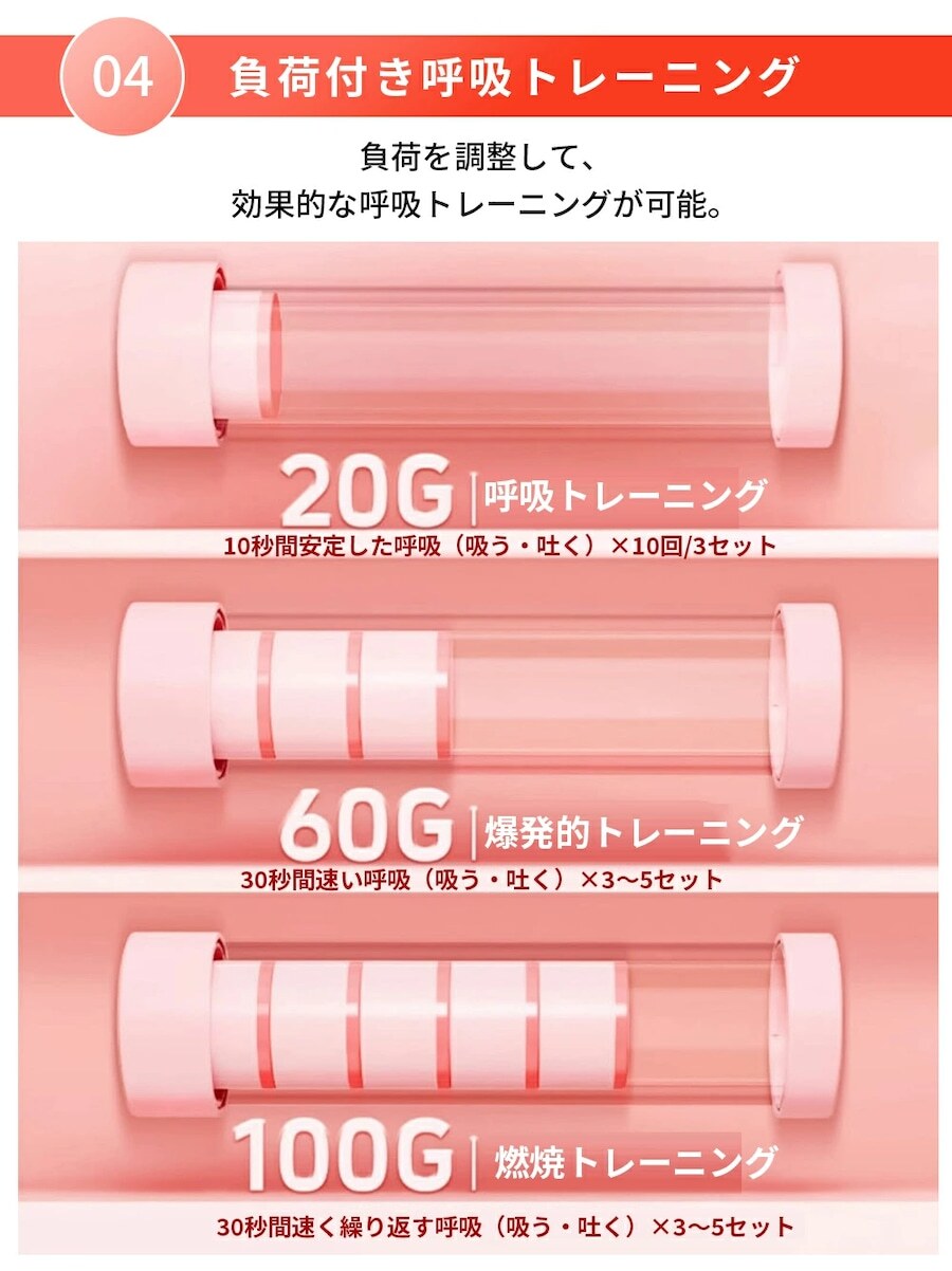 → 当社の製品は、ウェイトスタックで負荷を数値化(20g〜100g)、1分で肺活量の変化を実感、3週間で持久力最大40%UP※
