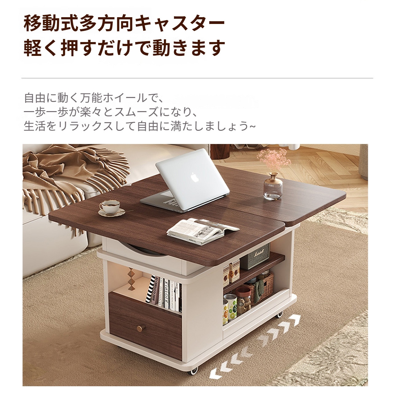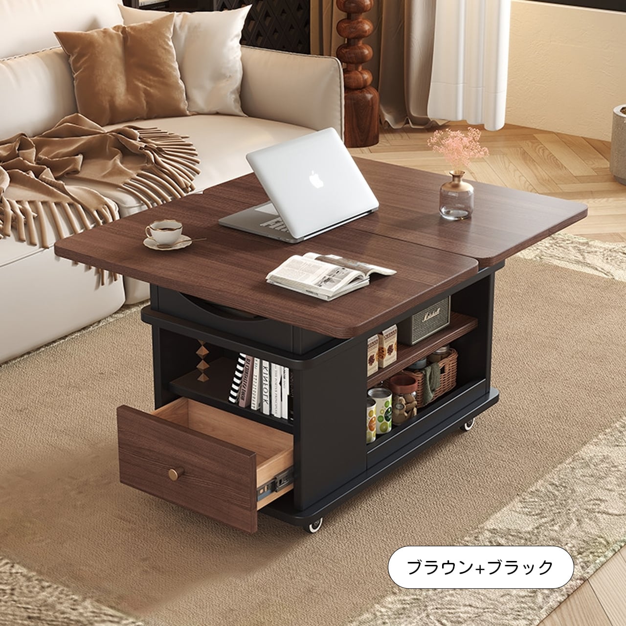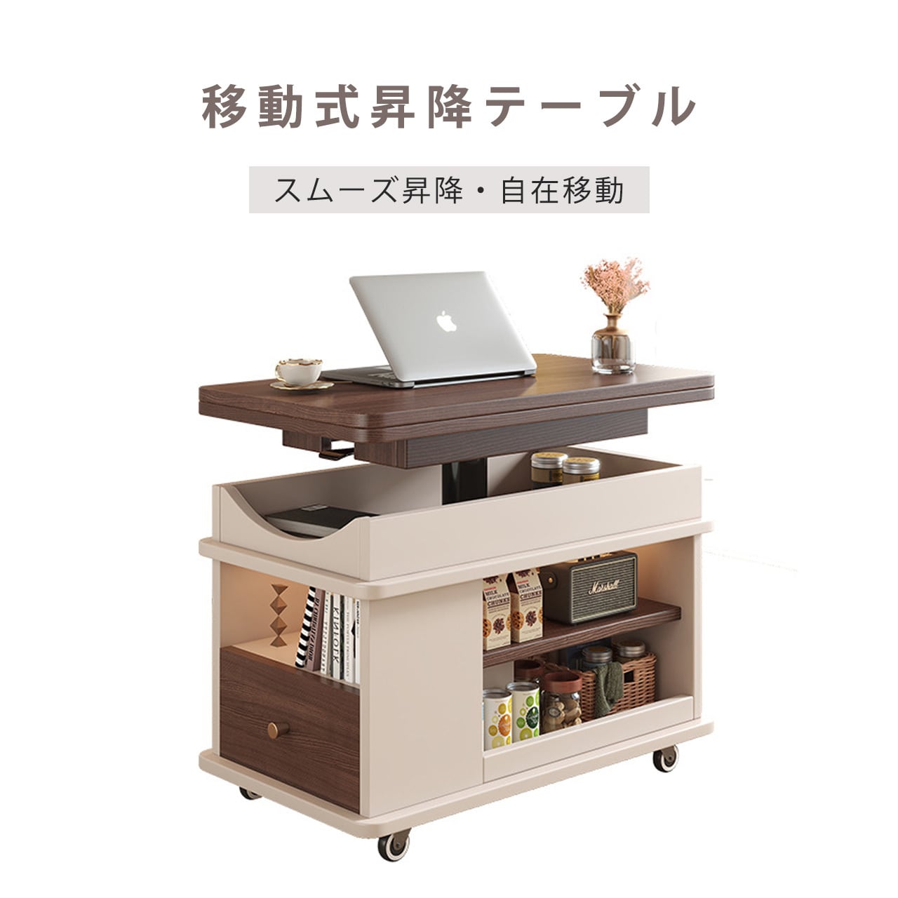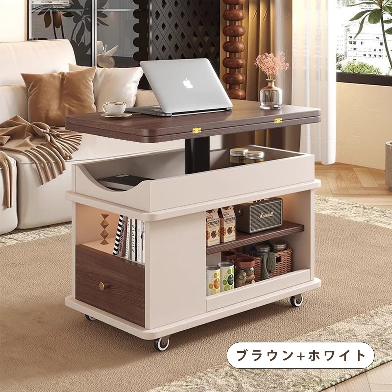 実木調の温かみのあるデザインで、どんなインテリアにも自然に溶け込みます。ソファサイドのテーブルとして、収納キャビネットとして、さらに昇降機能でワークスペースやダイニングテーブルにも変身。キャスター付きで自由に移動でき、不用時は折りたたんでコンパクトに収納できるため、1LDKやワンルーム生活に最適な万能アイテムです。