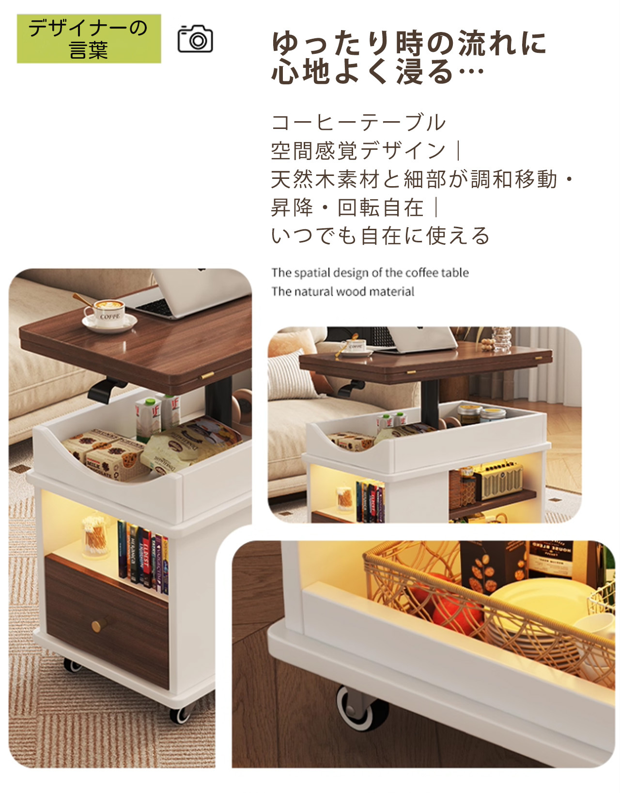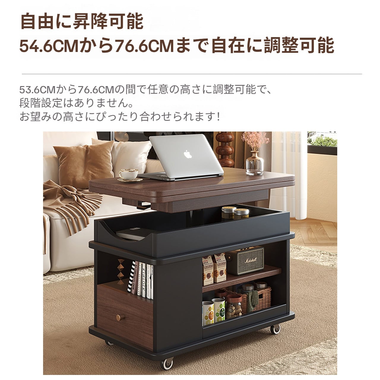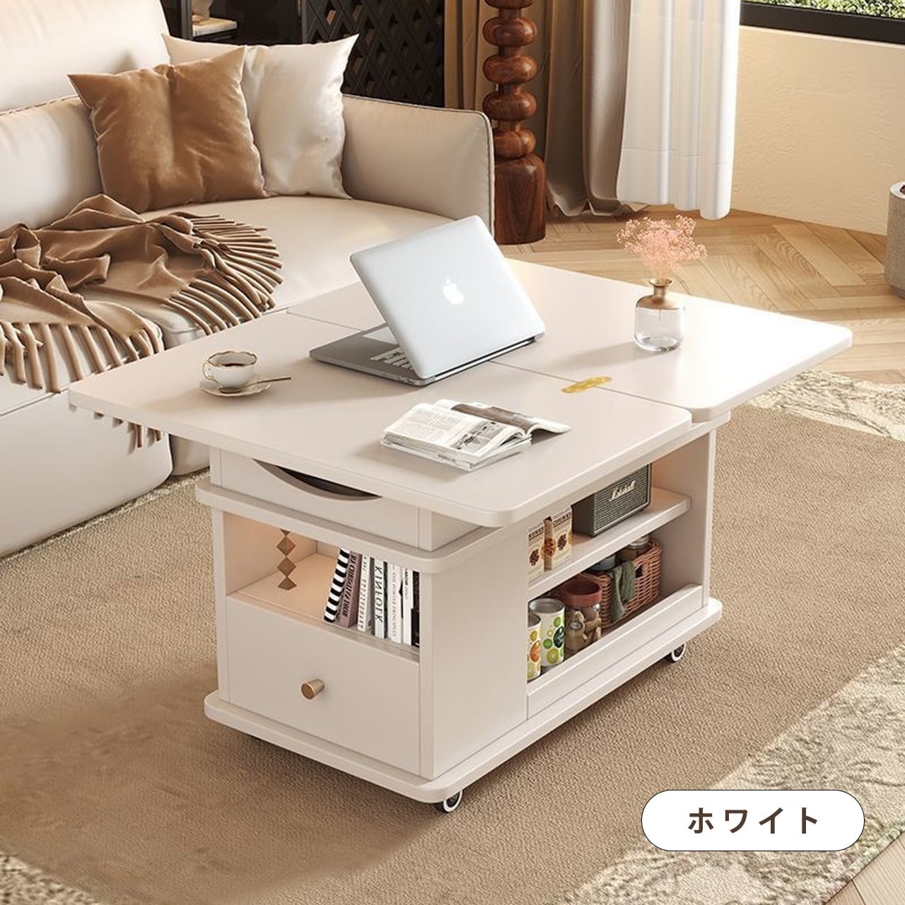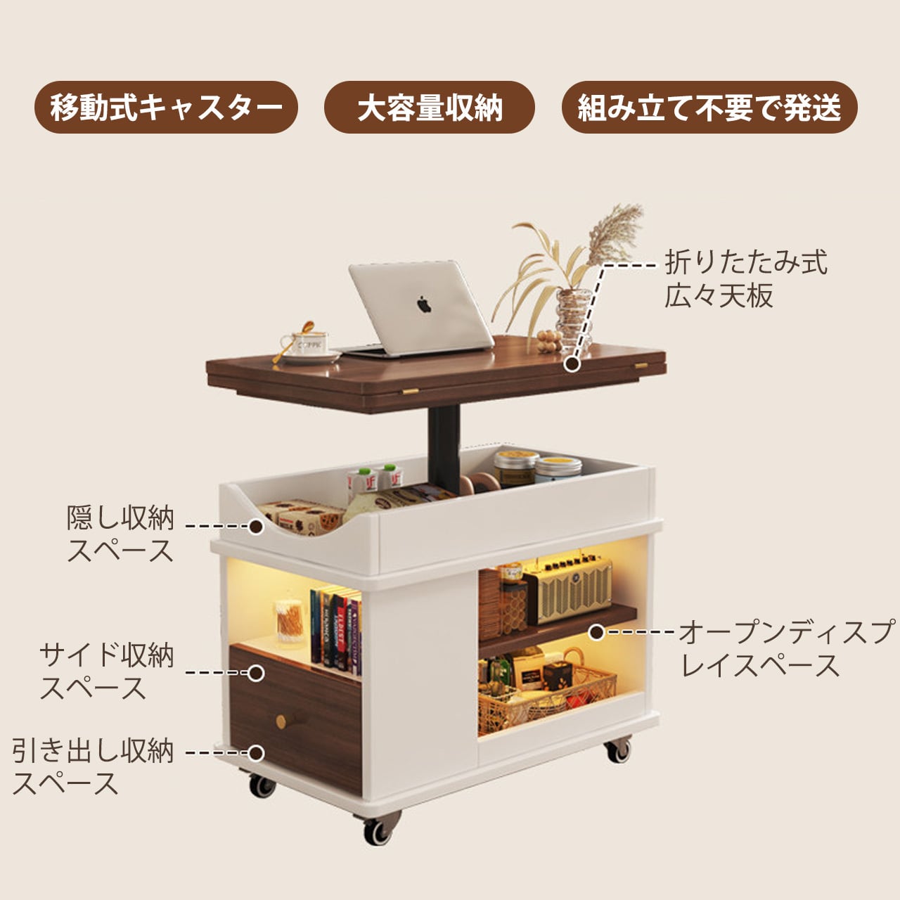 実木調の温かみのあるデザインで、どんなインテリアにも自然に溶け込みます。ソファサイドのテーブルとして、収納キャビネットとして、さらに昇降機能でワークスペースやダイニングテーブルにも変身。キャスター付きで自由に移動でき、不用時は折りたたんでコンパクトに収納できるため、1LDKやワンルーム生活に最適な万能アイテムです。