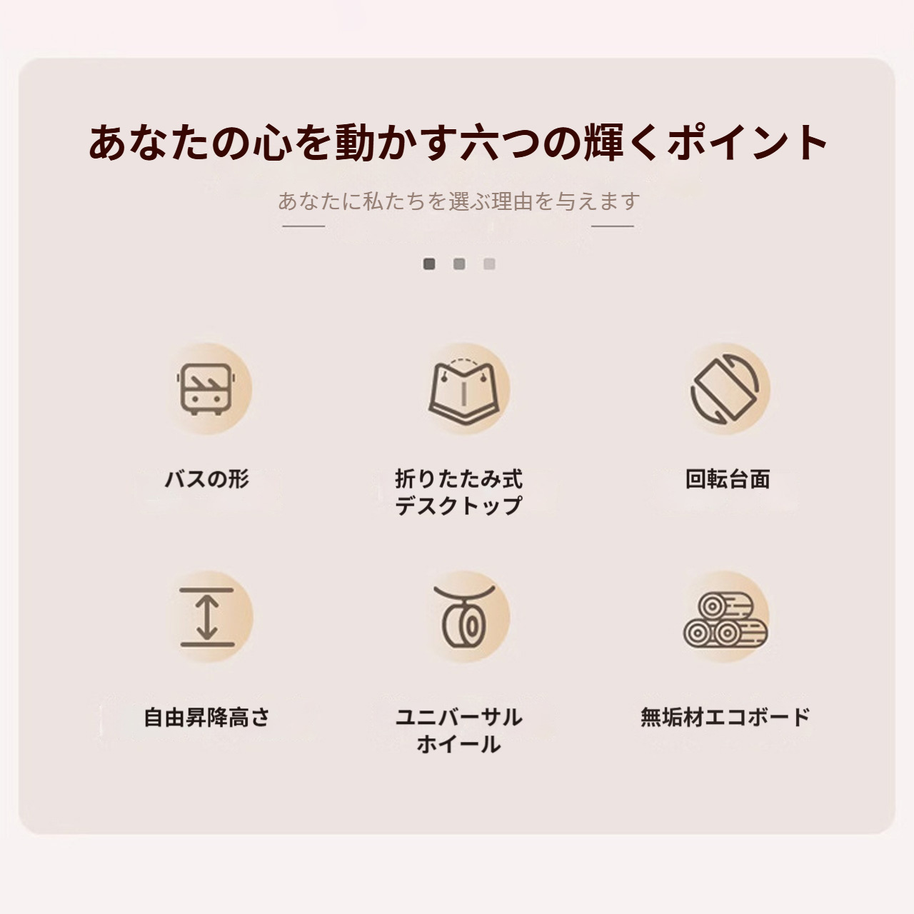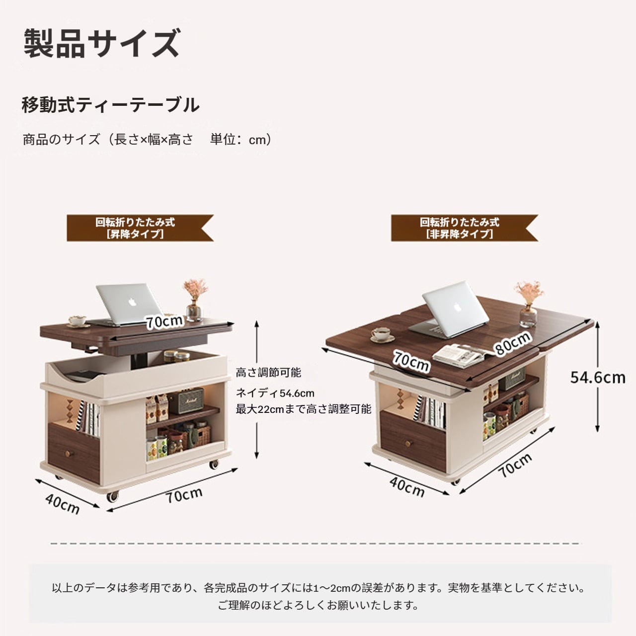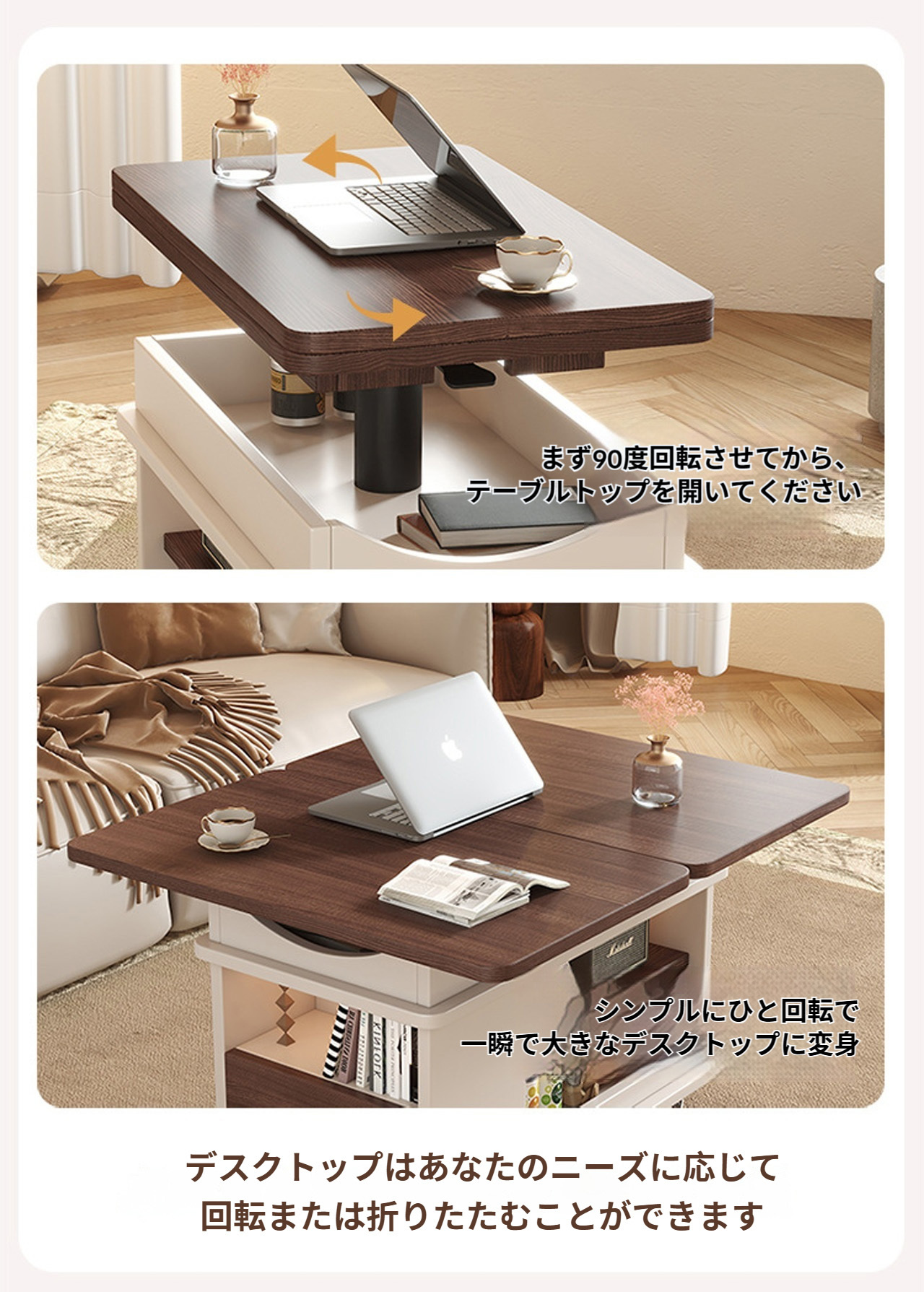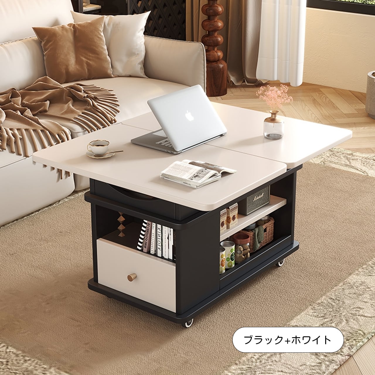実木調の温かみのあるデザインで、どんなインテリアにも自然に溶け込みます。ソファサイドのテーブルとして、収納キャビネットとして、さらに昇降機能でワークスペースやダイニングテーブルにも変身。キャスター付きで自由に移動でき、不用時は折りたたんでコンパクトに収納できるため、1LDKやワンルーム生活に最適な万能アイテムです。