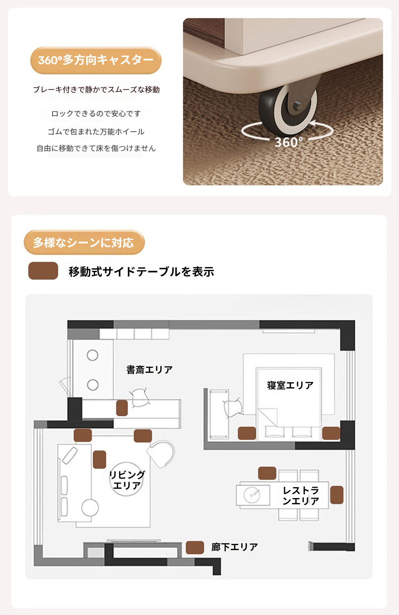 4個のキャスター付きで、リビングからベッドサイド、キッチンまでスムーズに移動。キャスターは静音設計で、床を傷つけることもなく、使用中に騒音が発生しません。