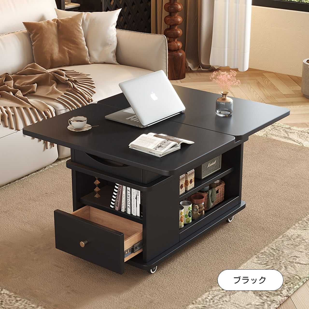 お茶を置く小さなテーブルから、書類を整理するワークスペース、雑貨を収納するキャビネットまで、一つで生活の幅を広げます。