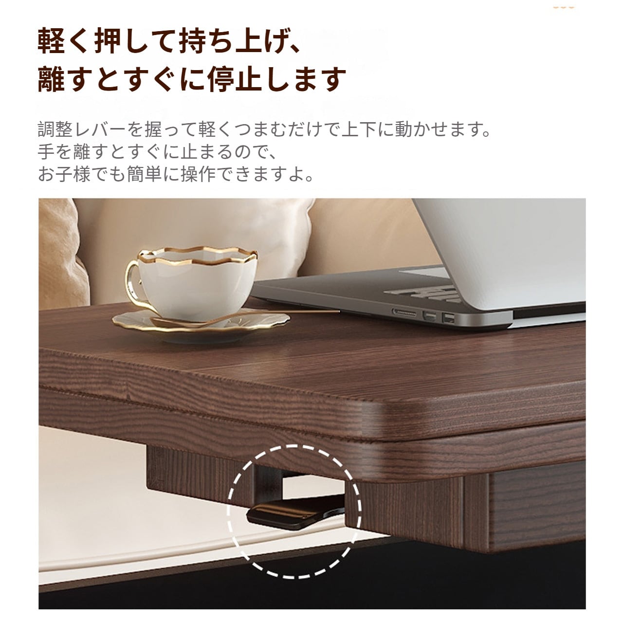 - 在宅ワーク:昇降機能でデスクとして活用、ノートPCや書類を置くスペース