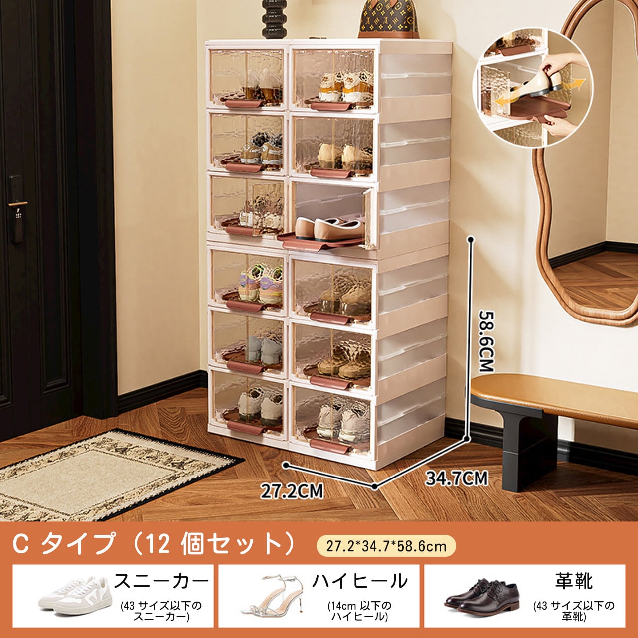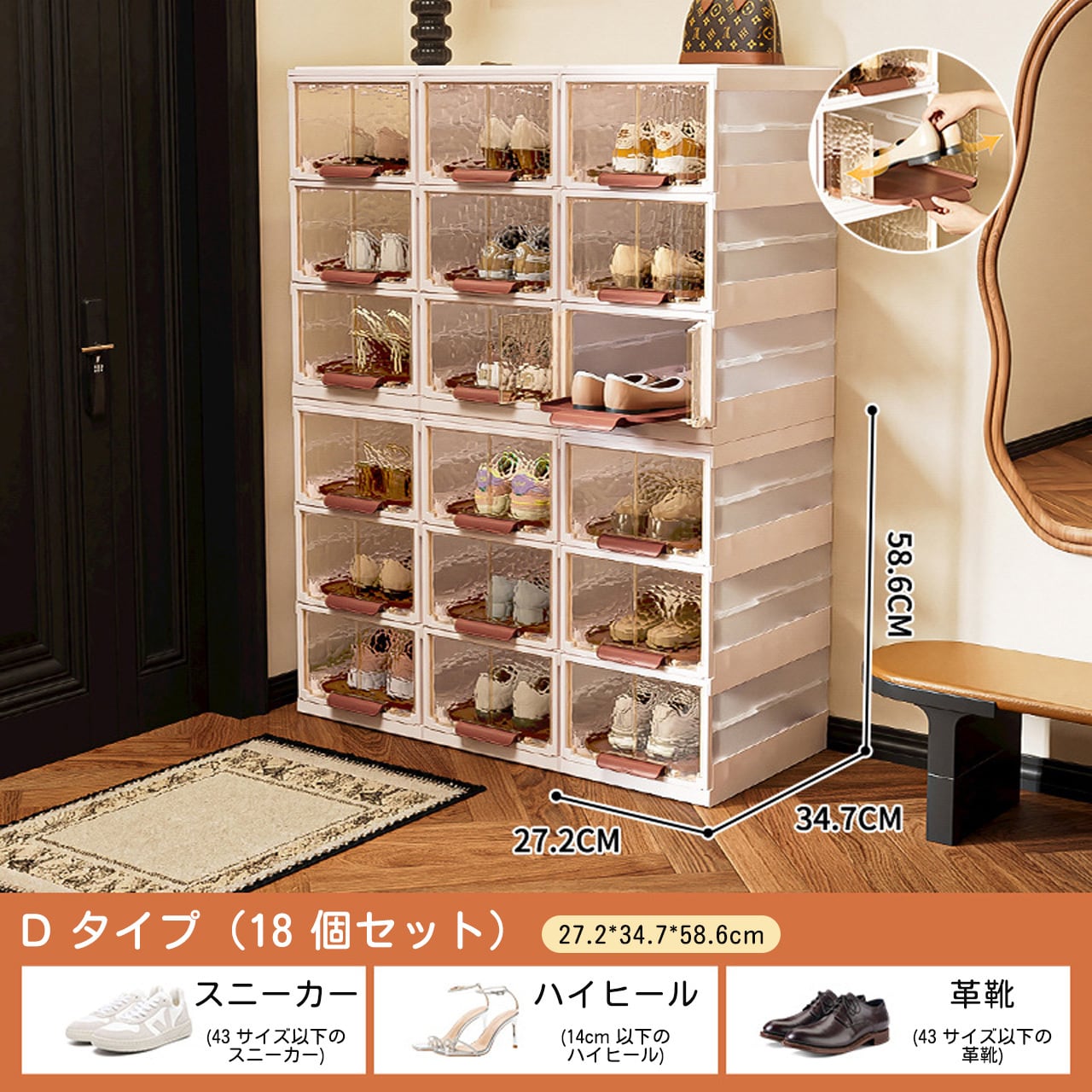 - 玄関:日常的な靴を収納し、玄関をスッキリと保つ主力収納アイテム