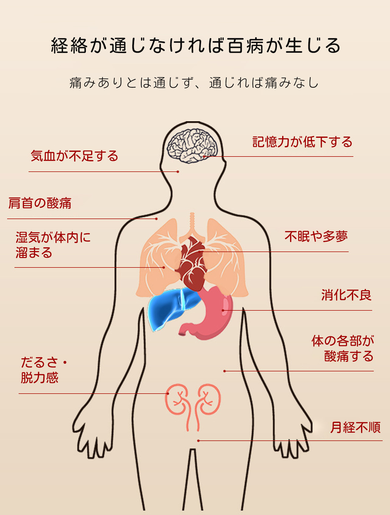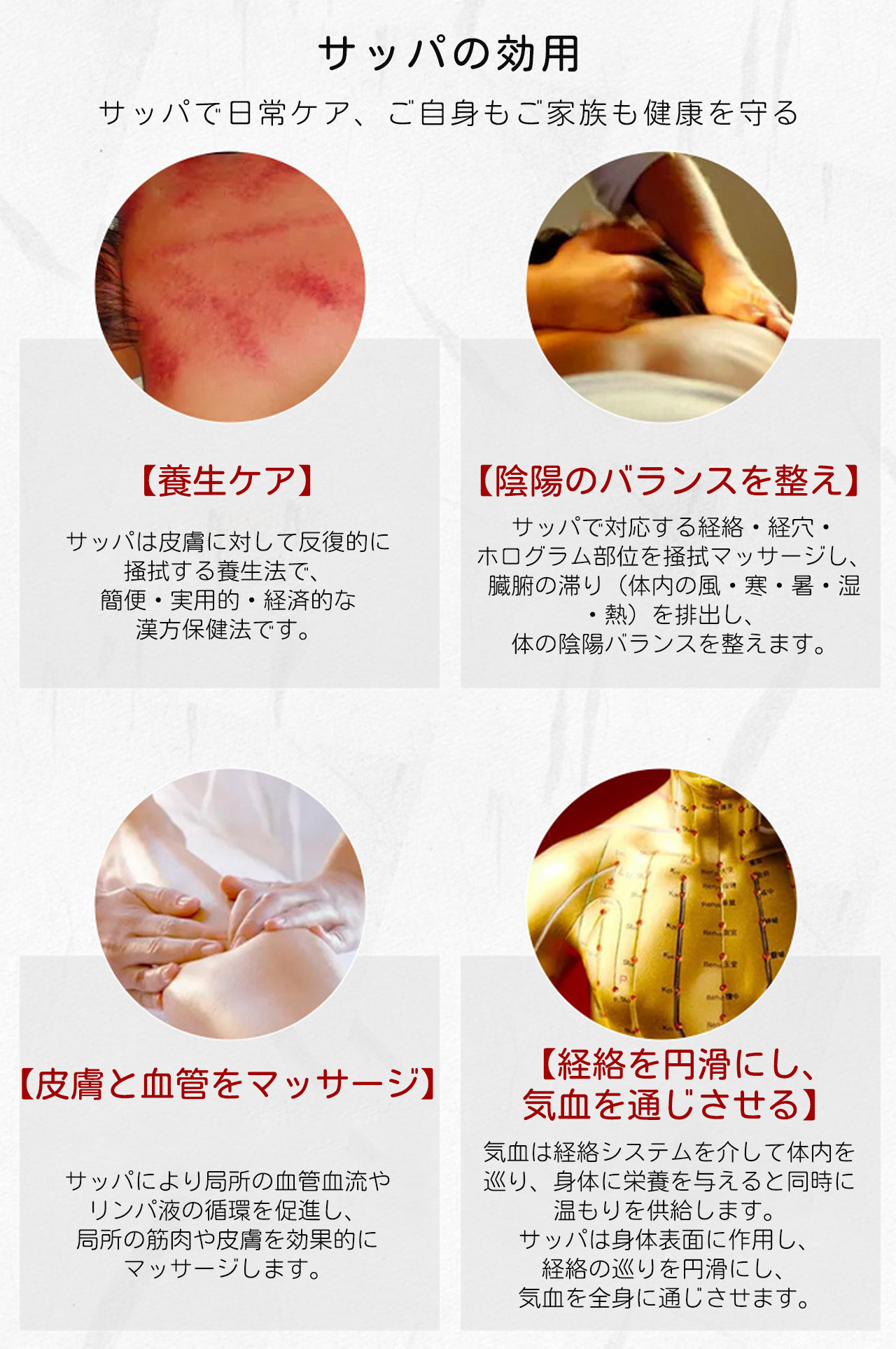 正しく刮痧することで体の血行を促進,筋肉の緊張や凝りを緩和し、日常の疲れや肩頚のこりを効果的に解消。寝起きの体のだるさや久坐の疲れに最適。