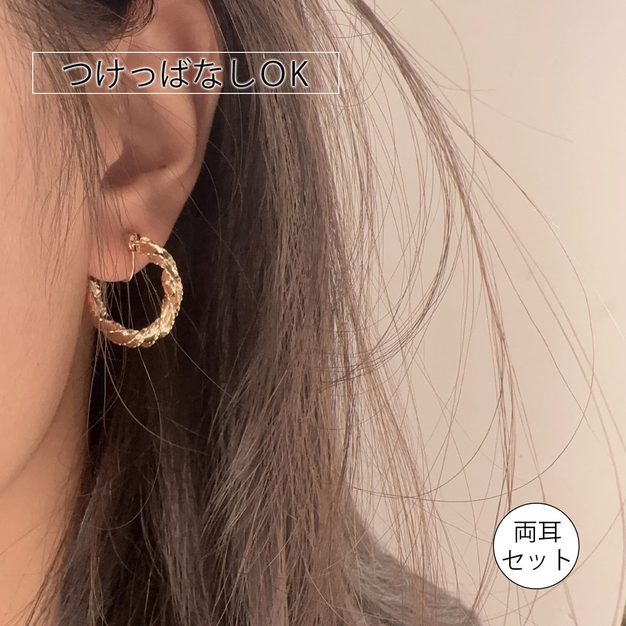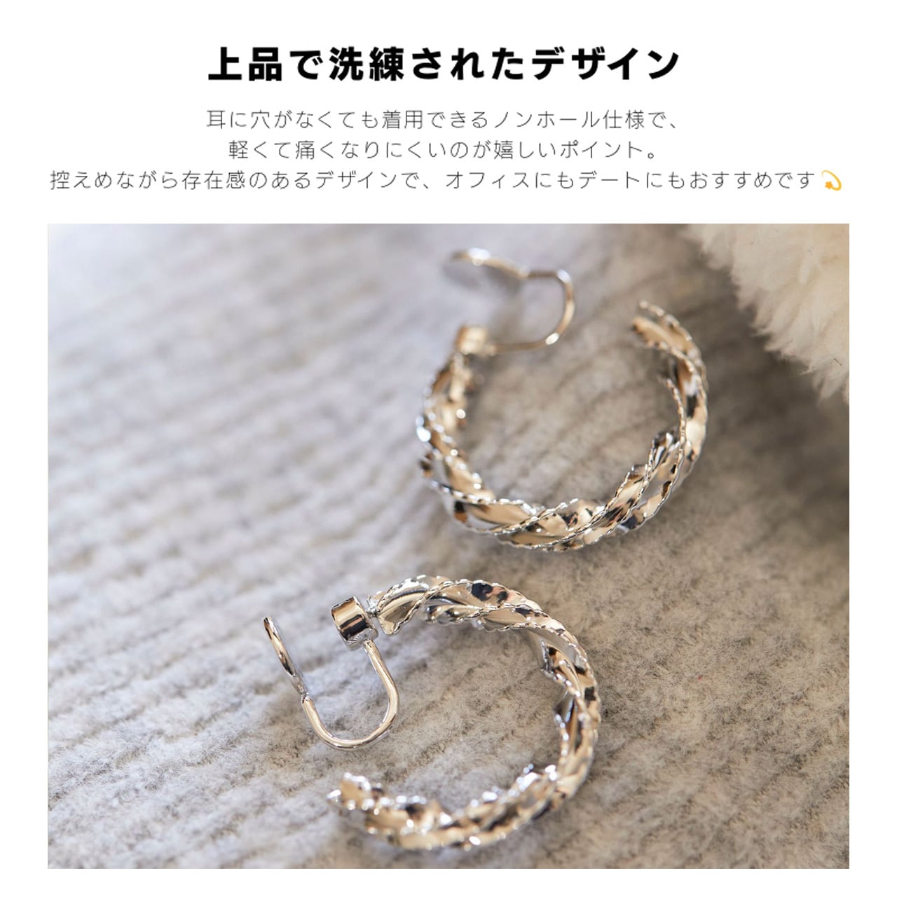軟質シリコーンを採用したモスキートコイル構造が耳たぶを優しく包み、強い締め付け感がないため、通勤やデートなど長時間着用しても痛みを感じにくいです。ピアスホールがない方やホールが痛い日にも最適。