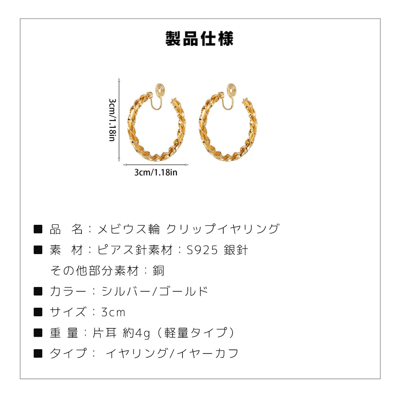 ビウスの輪の無限のラインをデザインに取り入れ、回転可能な構造で遊び心も加わります。モスキートコイル式のイヤークリップは無痛設計で長時間着用も安心し、ゴールドメッキの質感が通勤コーデに上品なアクセントを与えます。