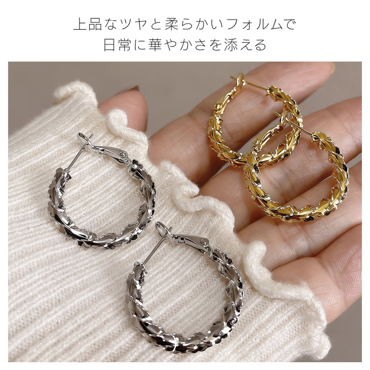 無駄のないフープデザインは、ビジネススーツからカジュアルなデニムまで、どんなコーデにも自然に溶け込みます。上品なアクセントとして、通勤やオフィスシーンで活躍します。
