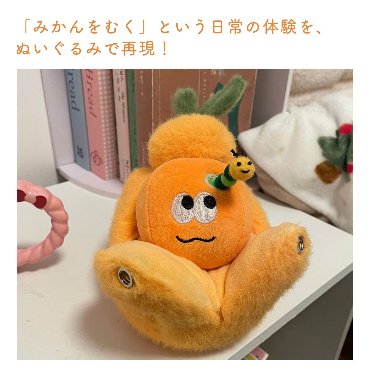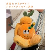 もちもちのボア素材で作られたミカン本体に、虫洞から顔を出す小虫のデザインがクリエイティブで愛らしい。