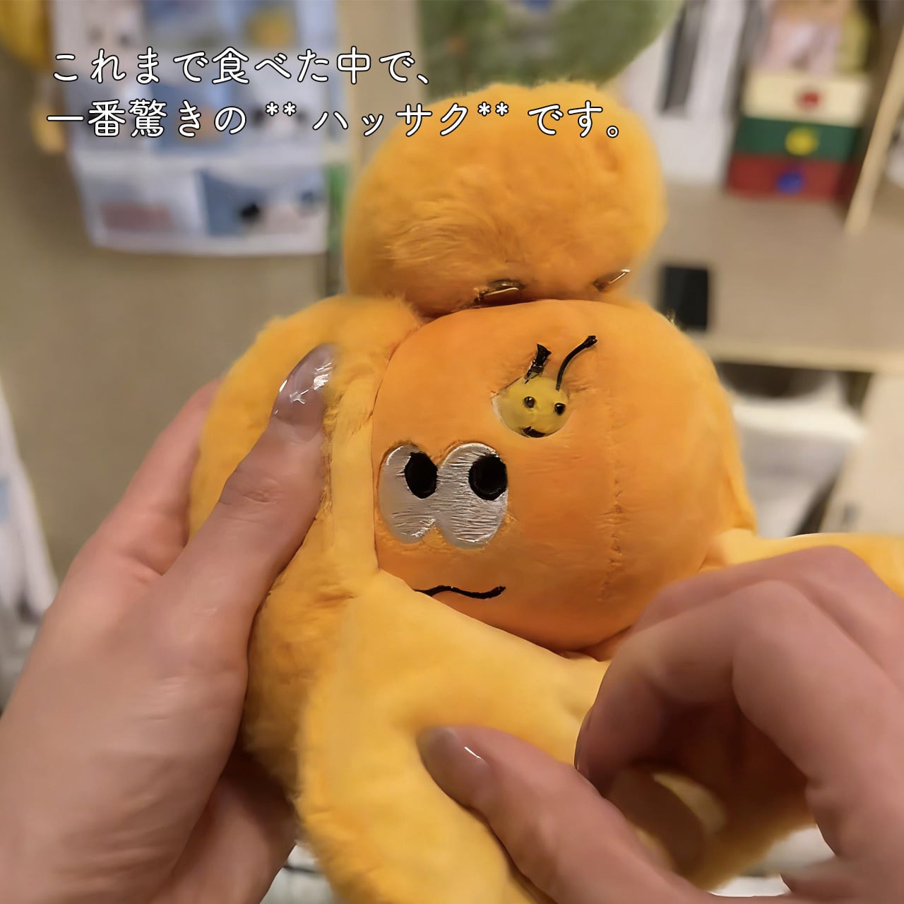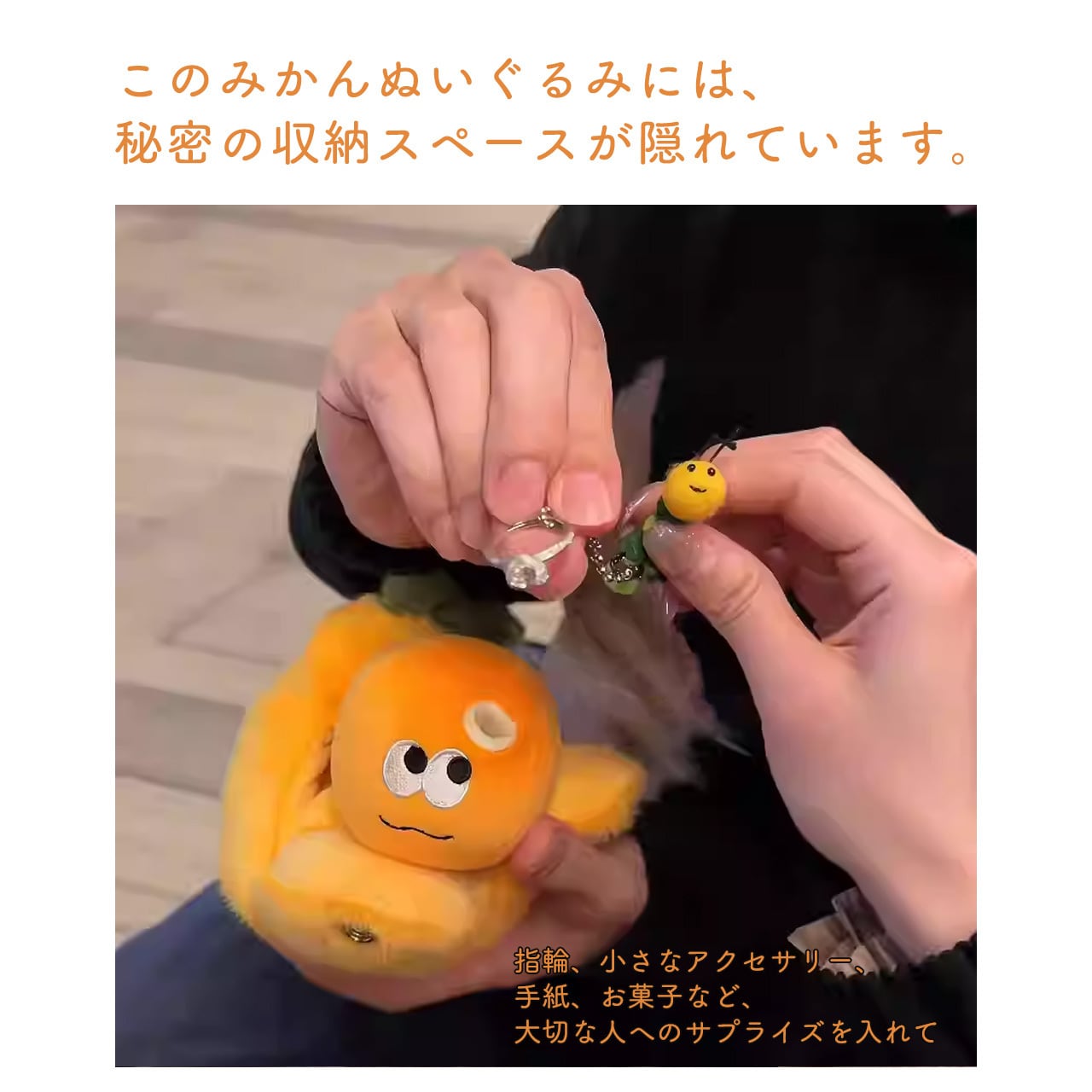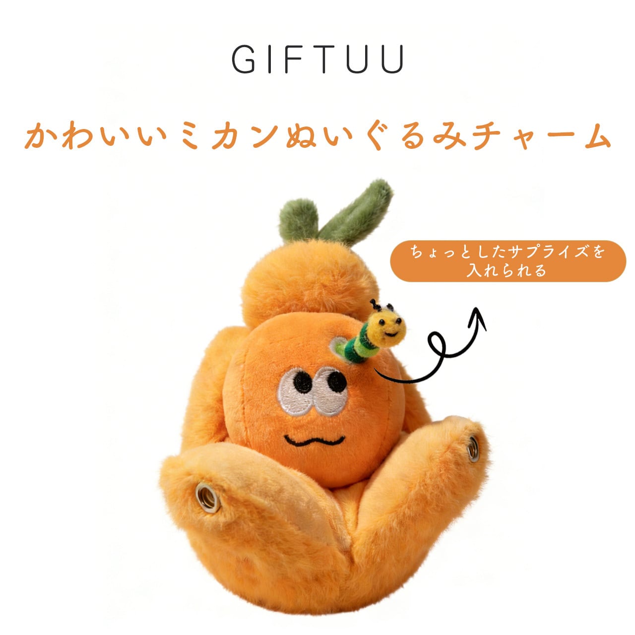 ミカンの側面に虫洞を再現し、そこから顔を出す小虫のぬいぐるみが付属。クリエイティブなデザインが話題性を生み、周囲の注目を集めます。