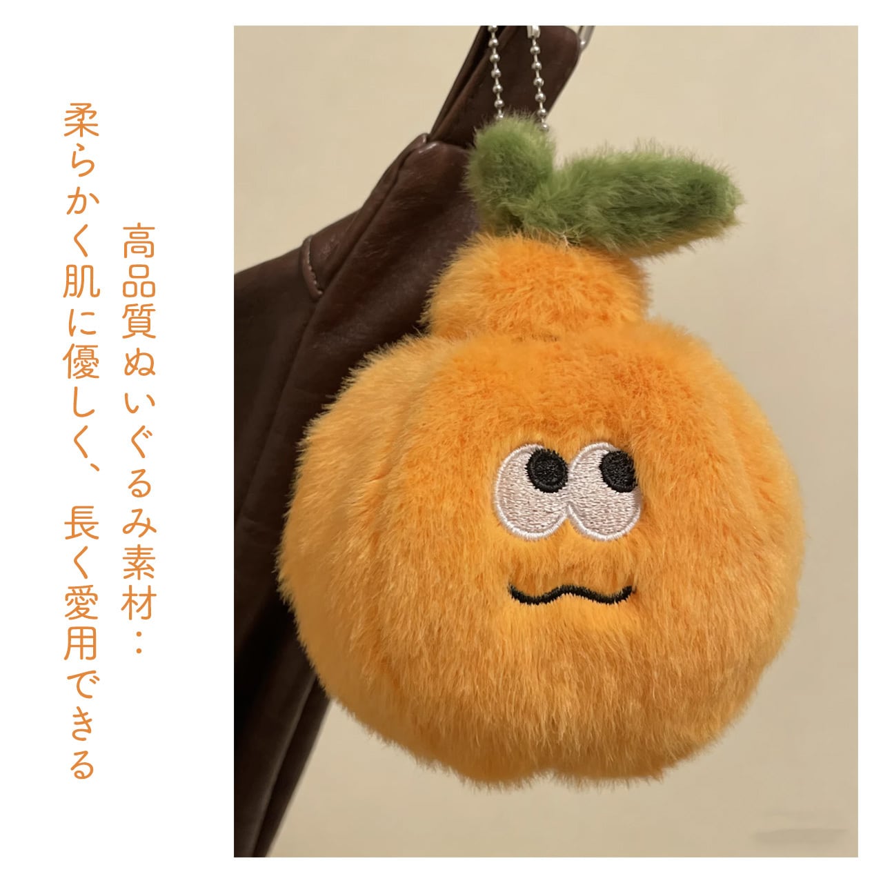 超柔らかなボア素材で作られたミカン本体が、触るとほっこりとした感触を与える。刺繍で描かれた表情が愛らしく、見た目だけでも癒やしを感じられます。