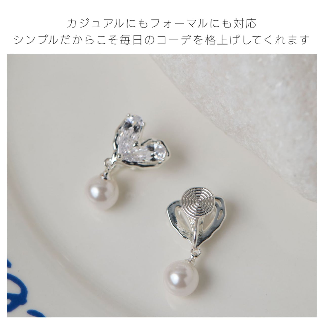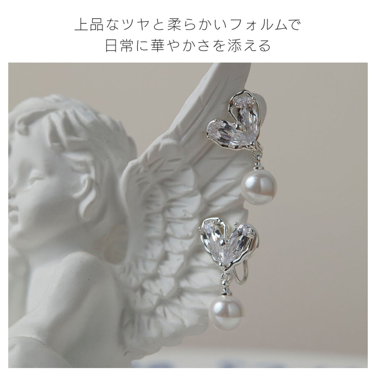 ハートの下に吊るされた艶やかなパールが、耳元に優しい揺らぎを与え、上品な女性らしさを引き立て。デイリーコーデからフォーマルなシーンまで、自然に溶け込みます。