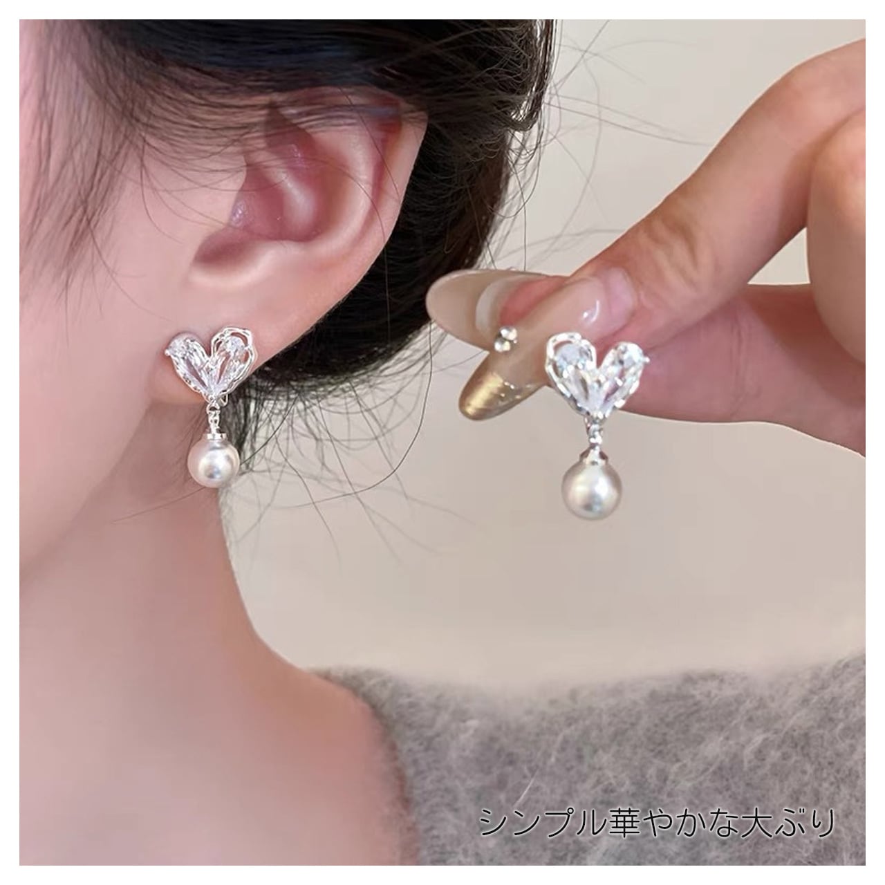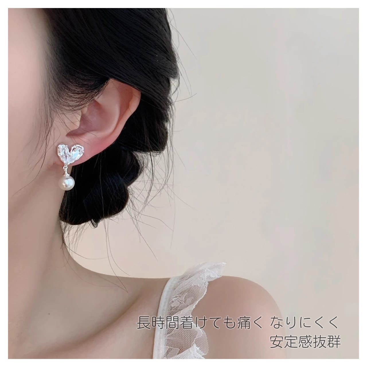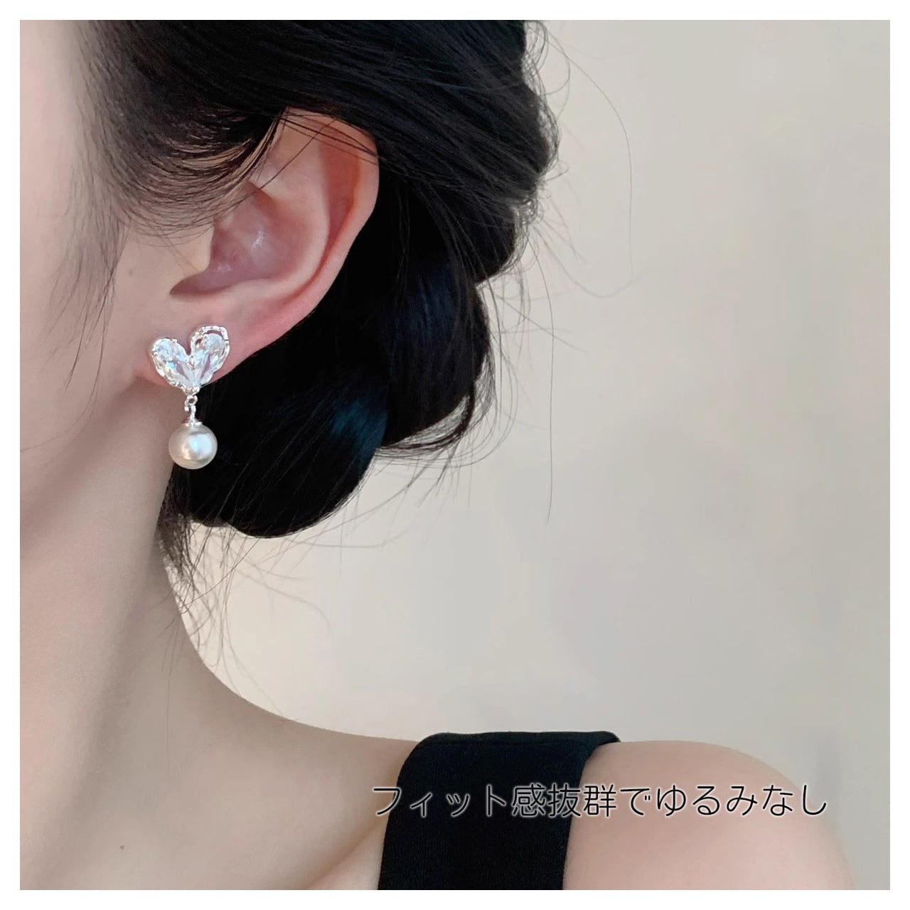 ハート型のクリスタルと艶やかなパールドロップが、丸顔や面長顔の輪郭を優しく引き立て、通勤からデートまであらゆるシーンで活躍する、甘くて上品なイヤリングです。