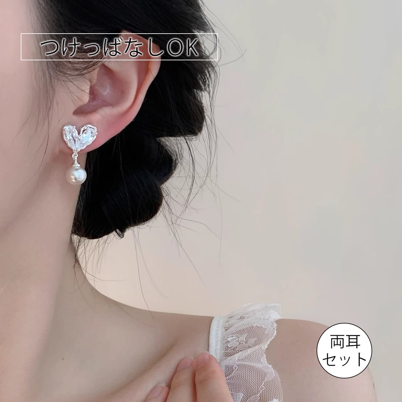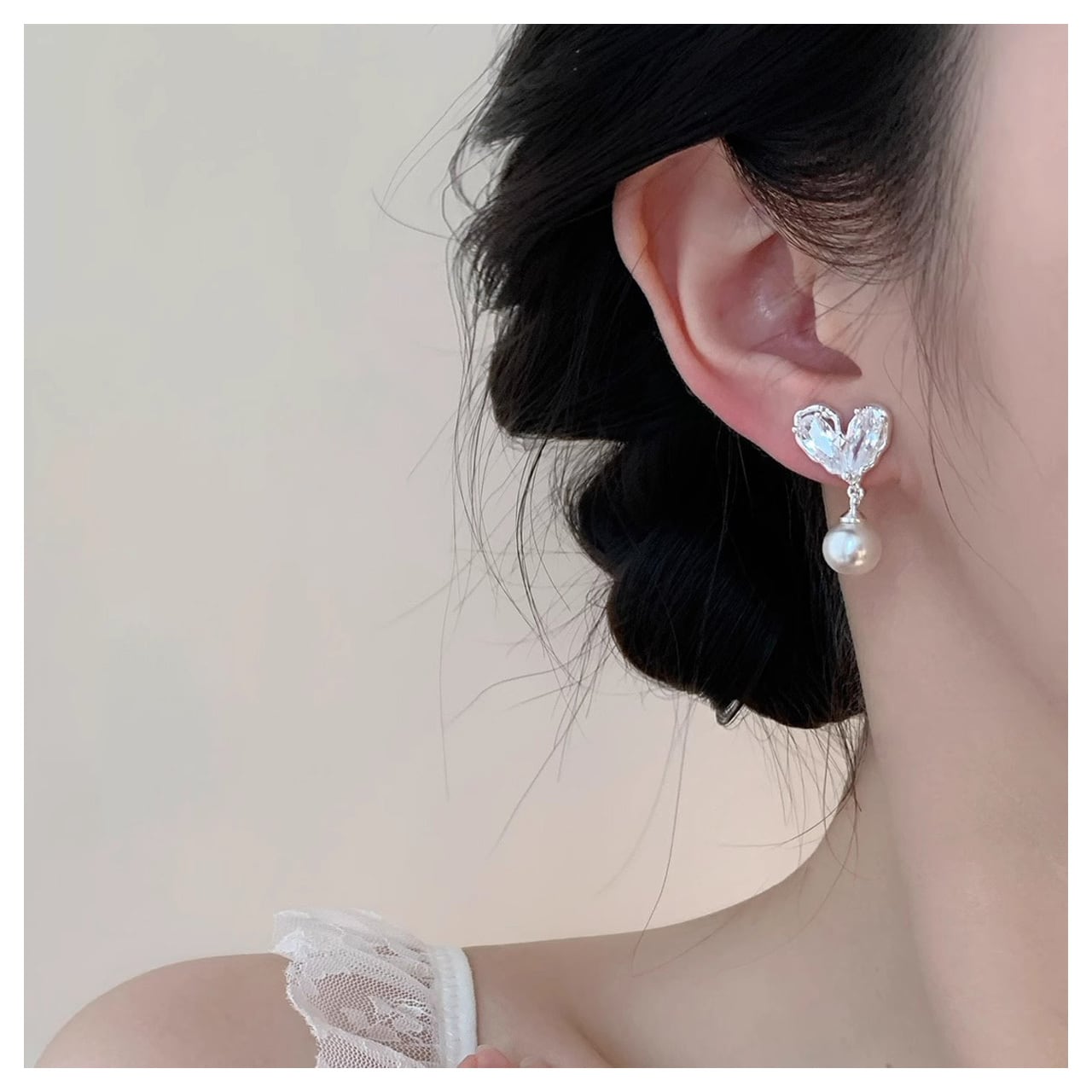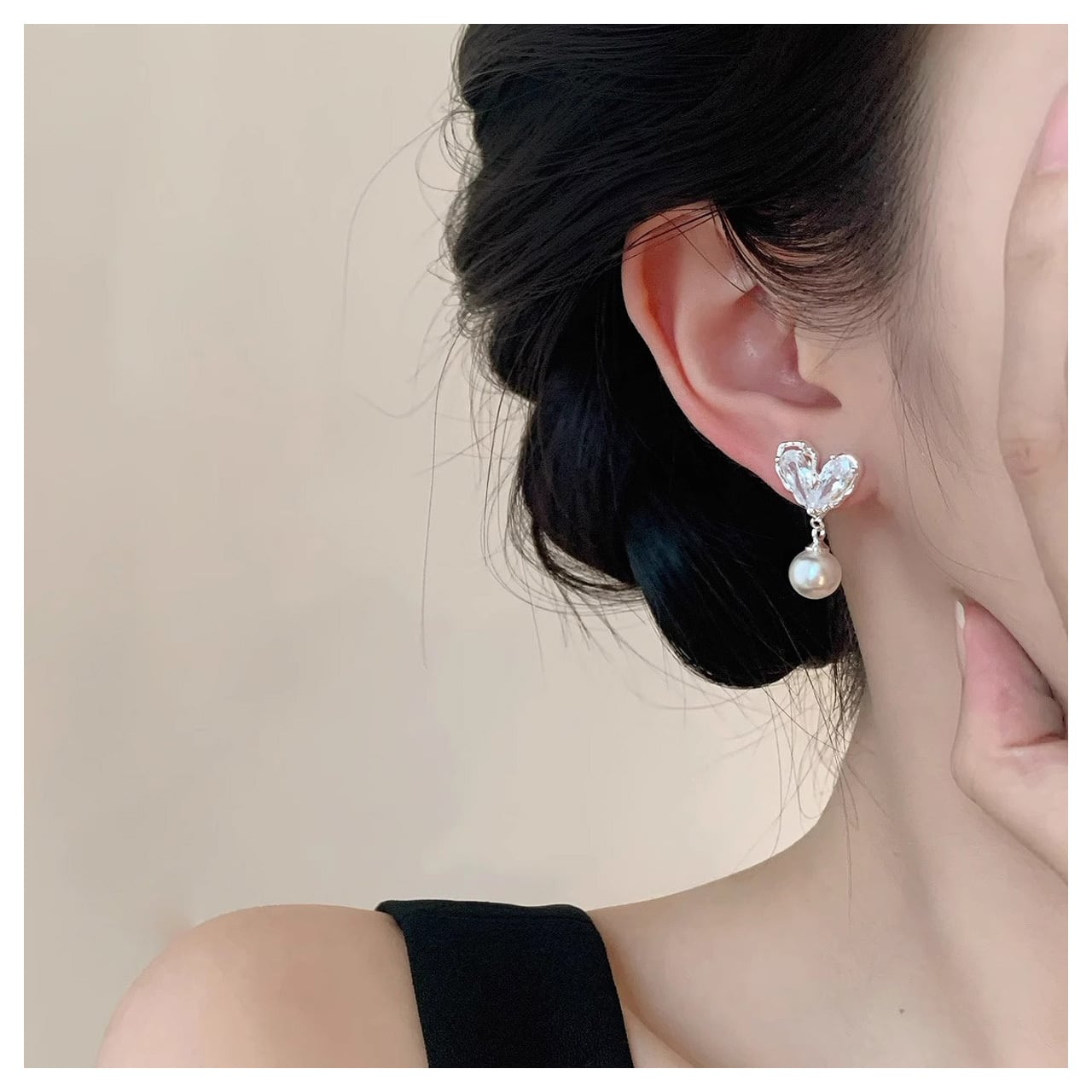 ハート型のクリスタルと艶やかなパールドロップが、丸顔や面長顔の輪郭を優しく引き立て、通勤からデートまであらゆるシーンで活躍する、甘くて上品なイヤリングです。
