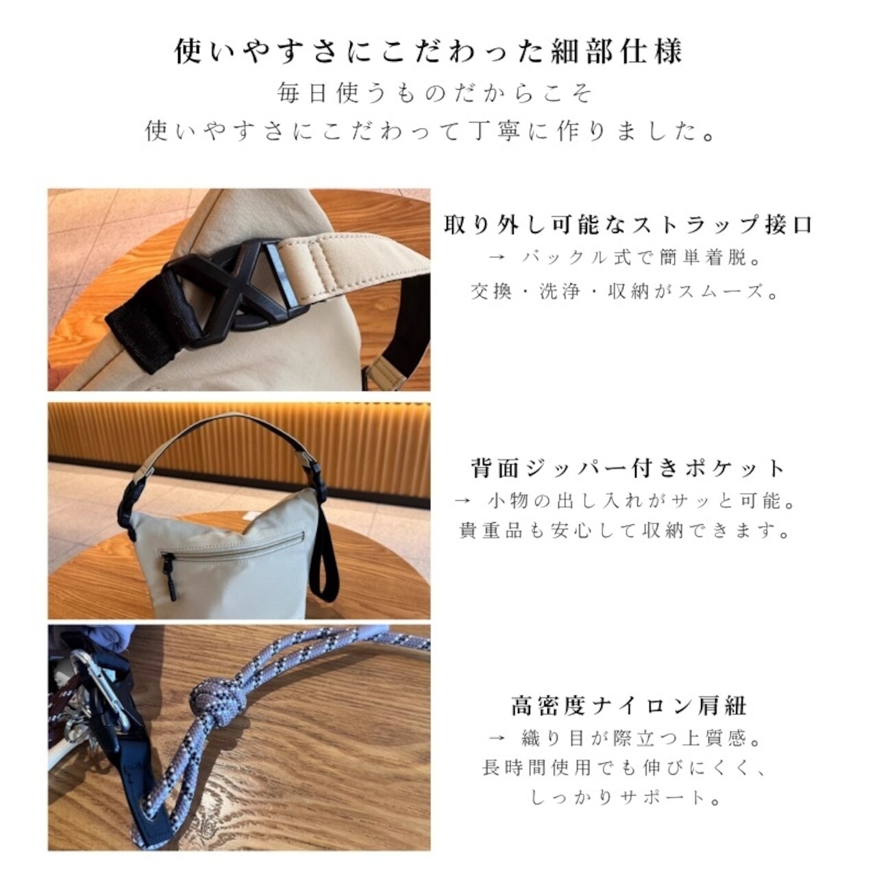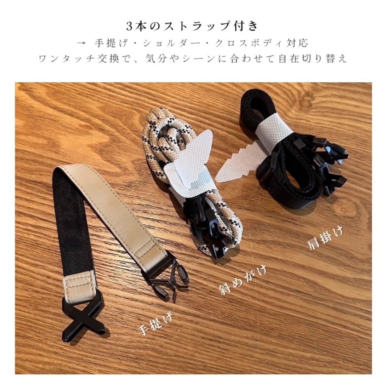 ■ 付属:手提げストラップ ×1 / ショルダーストラップ ×1 / クロスボディストラップ ×1(全3本・ワンタッチ交換式)