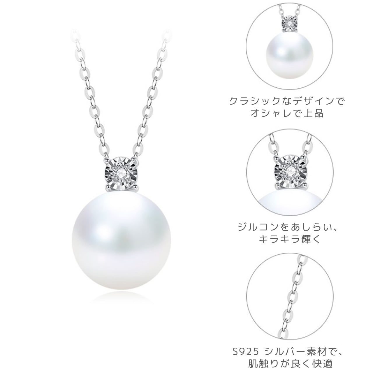 大粒のパールが首元を優雅に飾り、センターに輝くジルコニアが煌めきを添えます。S925 シルバーのチェーンが肌に優しく、長時間着用しても安心。日常のカジュアルコーデから、デートや記念日などの特別な日まで、一台で幅広く活躍します。