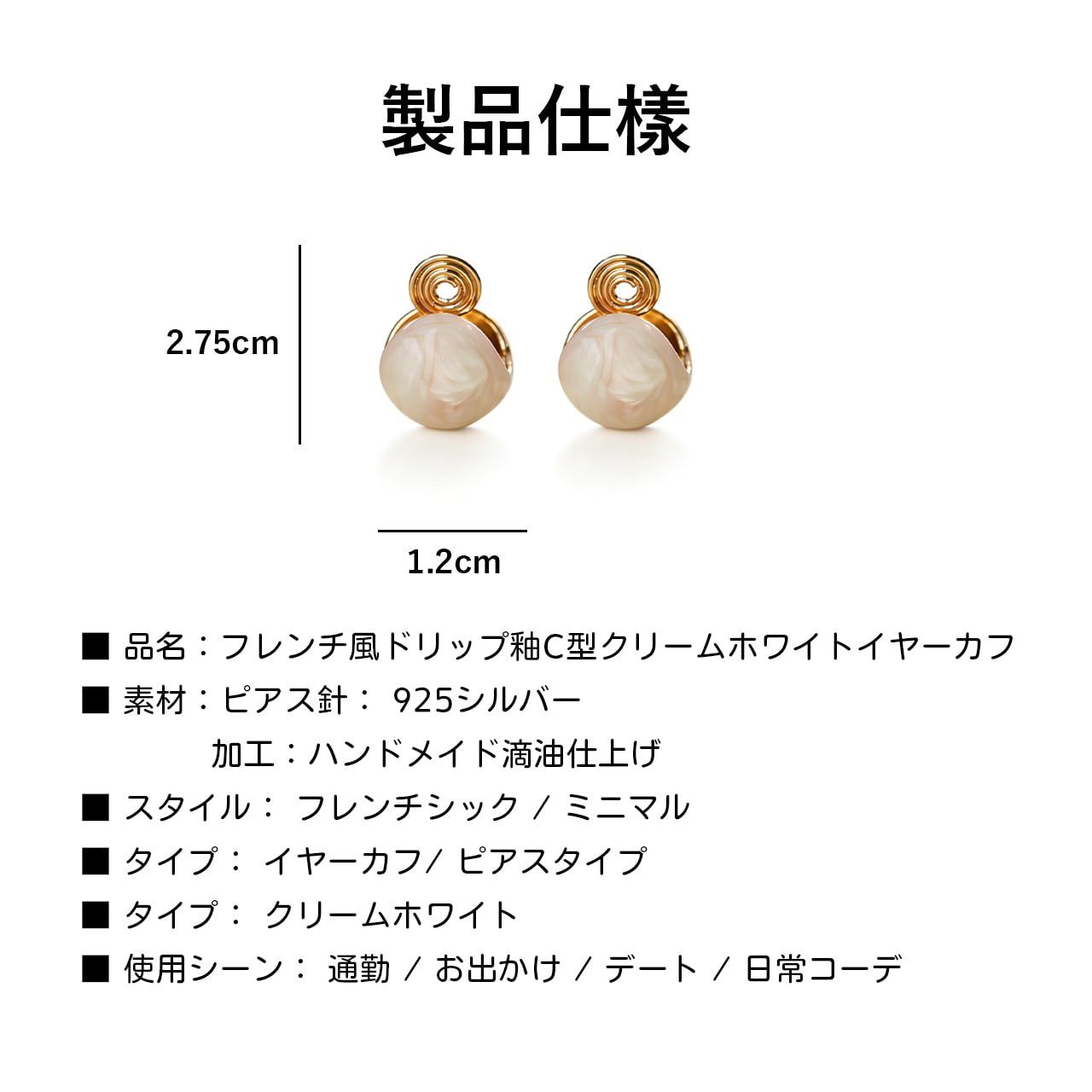 👗 フレンチ風ドリップ釉C型クリームホワイトイヤーカフ