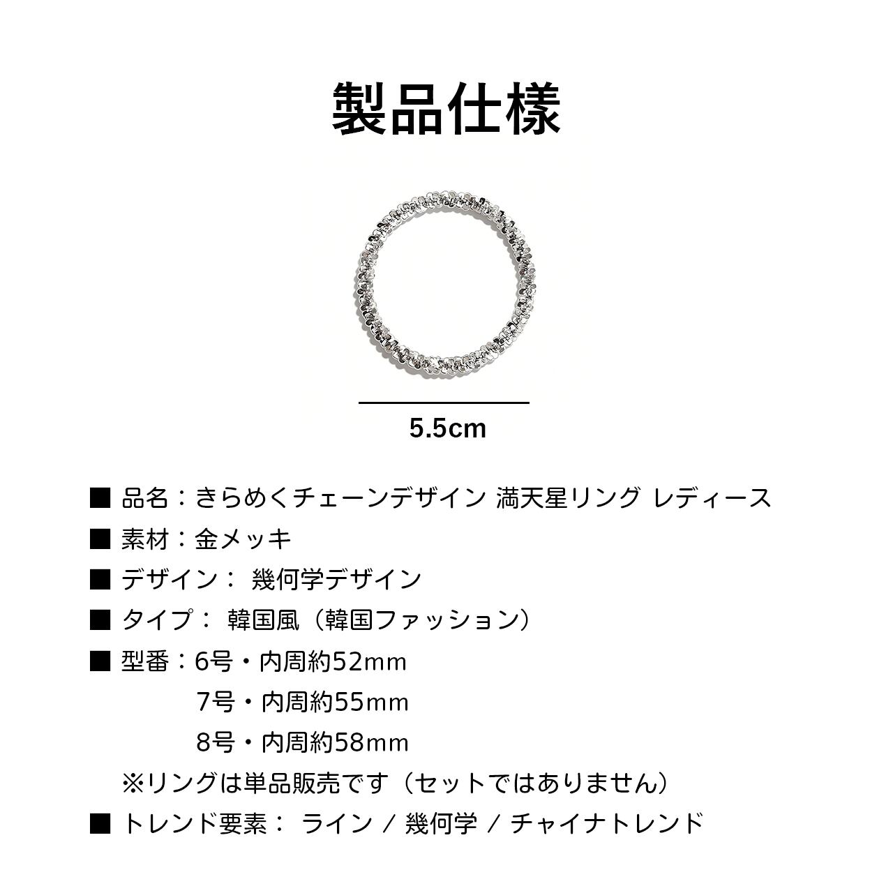 ・リングのサイズは、指の太さによって個人差があります。購入前に必ず自身の指の内周長を測定し、サイズ表をご確認ください。