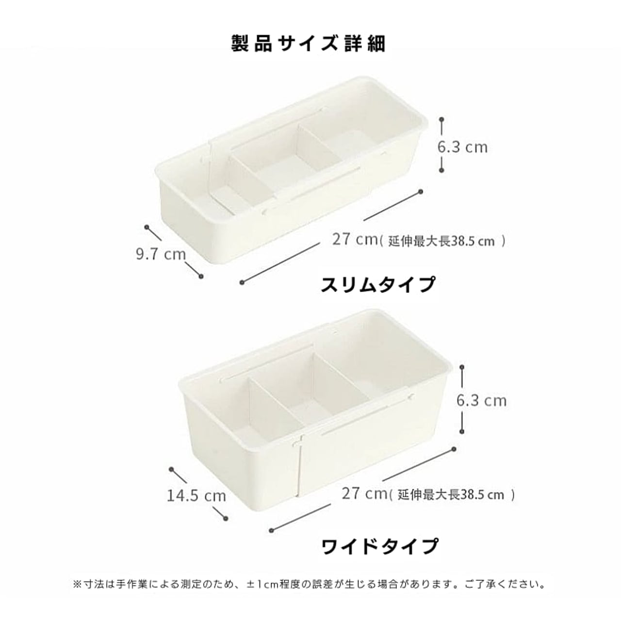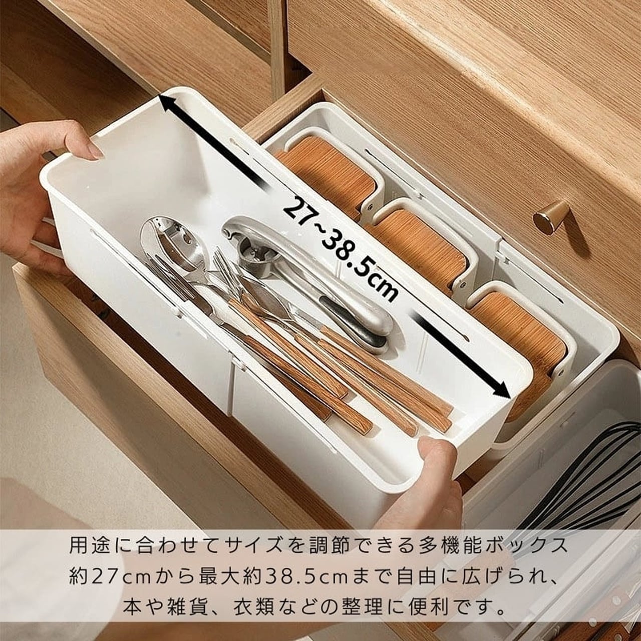 引き出しや棚の幅に合わせて、約27cmから38.5cmまでスライドで簡単にサイズ調整。無駄な空間を生み出さず、ぴったり収まります。